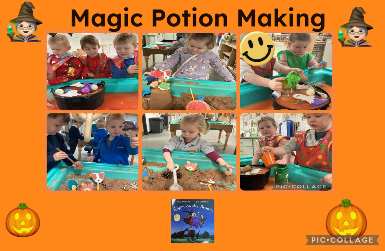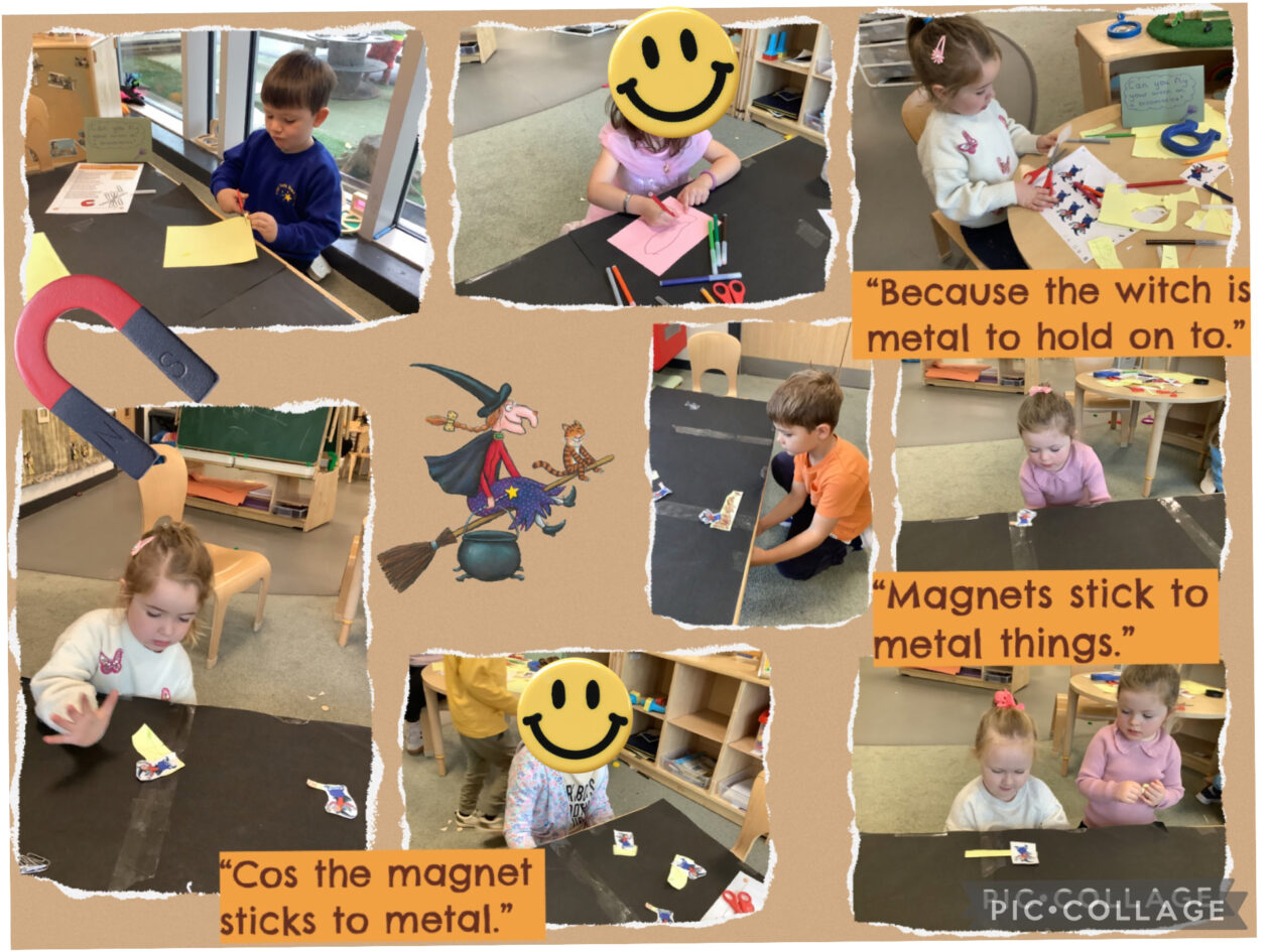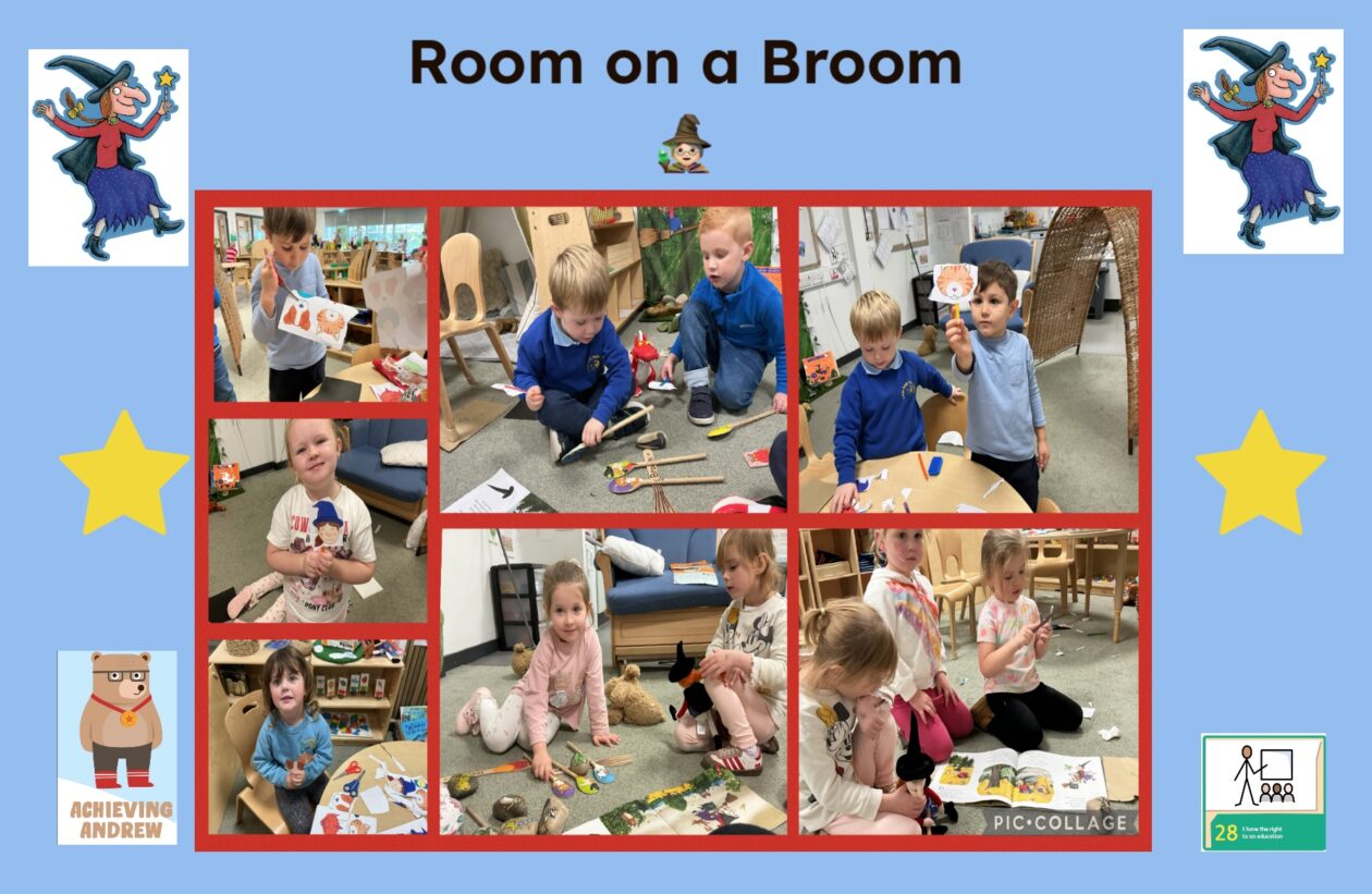 Working in line with our story of the month, we set up an experience for the children to sit on a log just like the broomstick, and listen to our story of the month “Room on the Broom”, some of the children joined in and finished some of the sentences and identified which item the witch would lose.