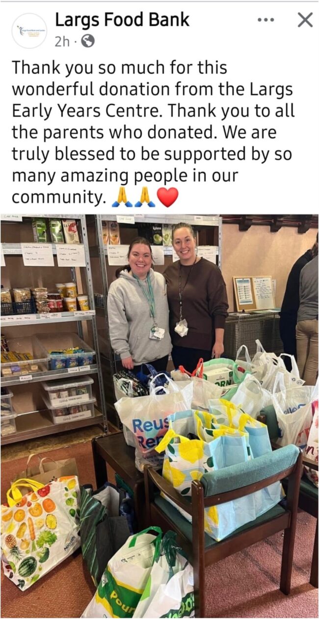 Donald and friends from Fairlie Gardens donated lots of produce to LEYC for our Harvest Day. Some of the children helped organise all the produce so this could be out on display for families to take away. In return families kindly donated items to be given to our local food bank!