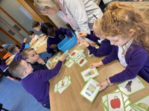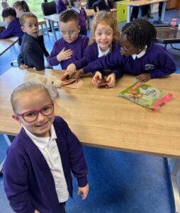 When we reached the farm, the children were very excited to spot calves, dairy cows, bulls, pigs and piglets, hens and horses. The cows were very smelly – which caused lots of giggles! It was a wonderful opportunity to see real farm animals up close and talk about how they are cared for.