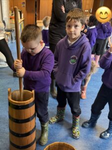 We then headed back to the museum building to warm up during our Farm to Fork workshop. We learned all about where our food comes from and thought carefully about which animals give us different foods. The children explored how milk is turned into butter using a traditional butter churn and even had a turn trying it themselves. We also looked at how wheat is ground into flour using a traditional quern stone and compared it to a modern-day grain mill. It was fascinating to see how methods have changed over time.