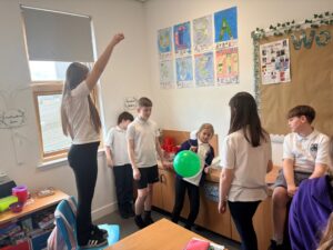 We had Poppy from our class, and some other STEM leaders, do a lesson for us on Monday. We did balloon rockets and talked about actions, reactions and forces.