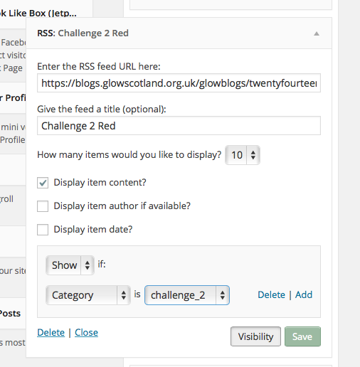 We add a sidebar widget showing the RSS feed for this blogs post tagged red. We use the widget visibility facility provided by Jetpack to only show the widget on posts categorised challenge_2