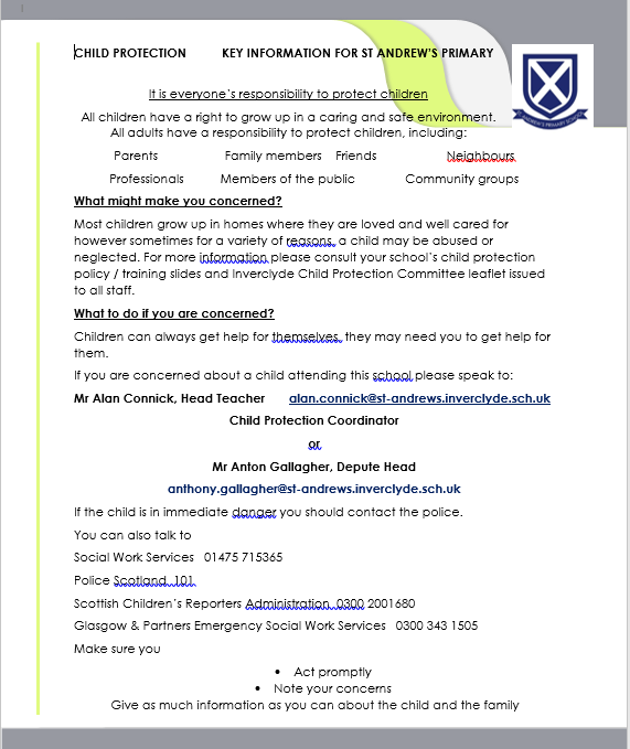 Inverclyde Council Education Services has Child Protection Guidelines and Procedures which all schools are required to follow. Education Services work very closely with other agencies namely Strathclyde Police, Social Work Services, NHS Greater Glasgow and Clyde and the Children’s Reporter to support children.