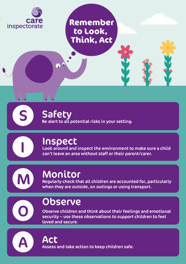 At our nursery, we are introducing SIMOA, our new safety elephant mascot, to help children learn about keeping themselves and others safe. SIMOA stands for Safety, Inspect, Monitor, Observe, Act — a child safety campaign designed to support early years staff, children, and parents in understanding how to prevent accidents and stay safe in different environments.