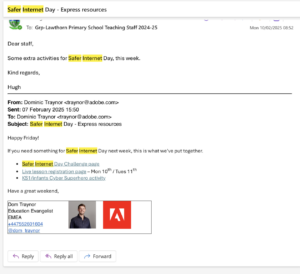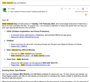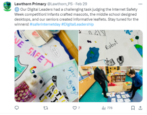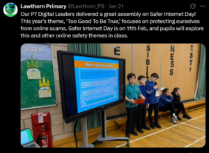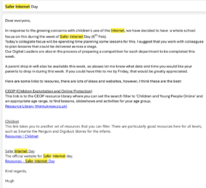 For the past two years we have a focus on Internet Safety during the week of Safer Internet Day. Pupils participate in activities in class and in 2023 we had a full school competition which was run by the Digital Leaders. See below for email sent to support staff in planning for the day/week. Time during collegiate meeting was also allocated for this. In 2023, our parent drop in, was also on the theme of Internet Safety.