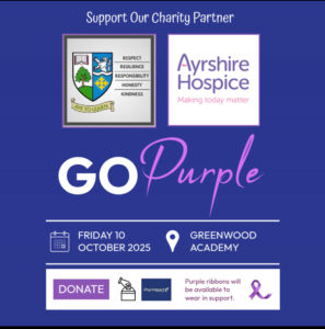 Support our charity partner by donating to Ayrshire Hospice this Friday. S6 Captains will be collecting as we welcome pupils in the morning as well donations welcome via IPay Impact. Many thanks for your support. 💜
