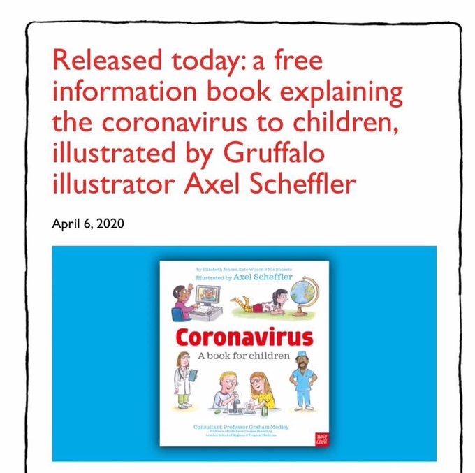 A digital book for primary school children illustrated by Alex Scheffler. https://nosycrow.com/blog/released-today-free-information-book-explaining-coronavirus-children-illustrated-gruffalo-illustrator-axel-scheffler/…