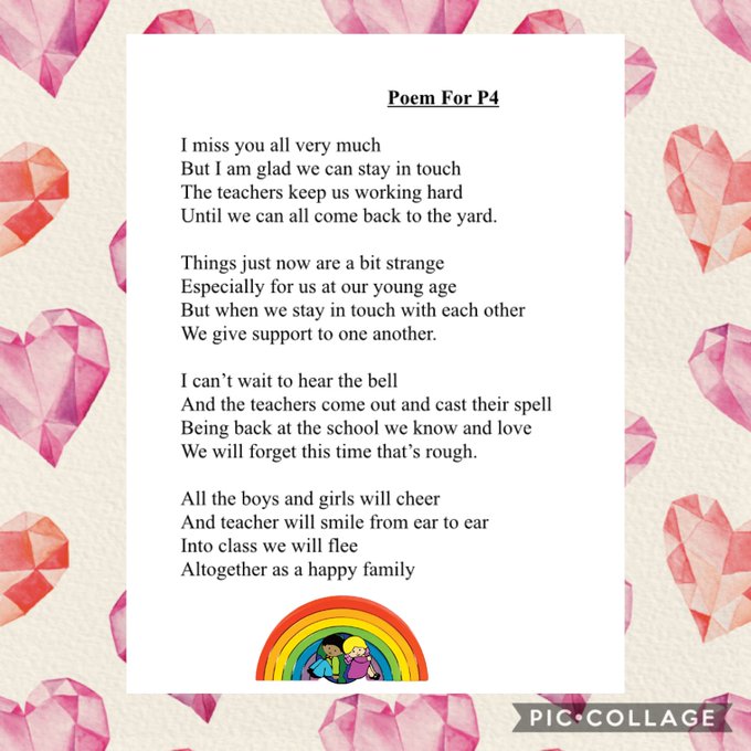 It has been great to see the engagement in Home Learning this week. THANK YOU for unwavering commitment from all teachers/staff and excellent effort from our amazing children. A wonderful P4 girl wrote this beautiful piece of poetry.