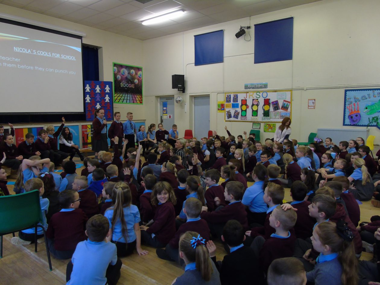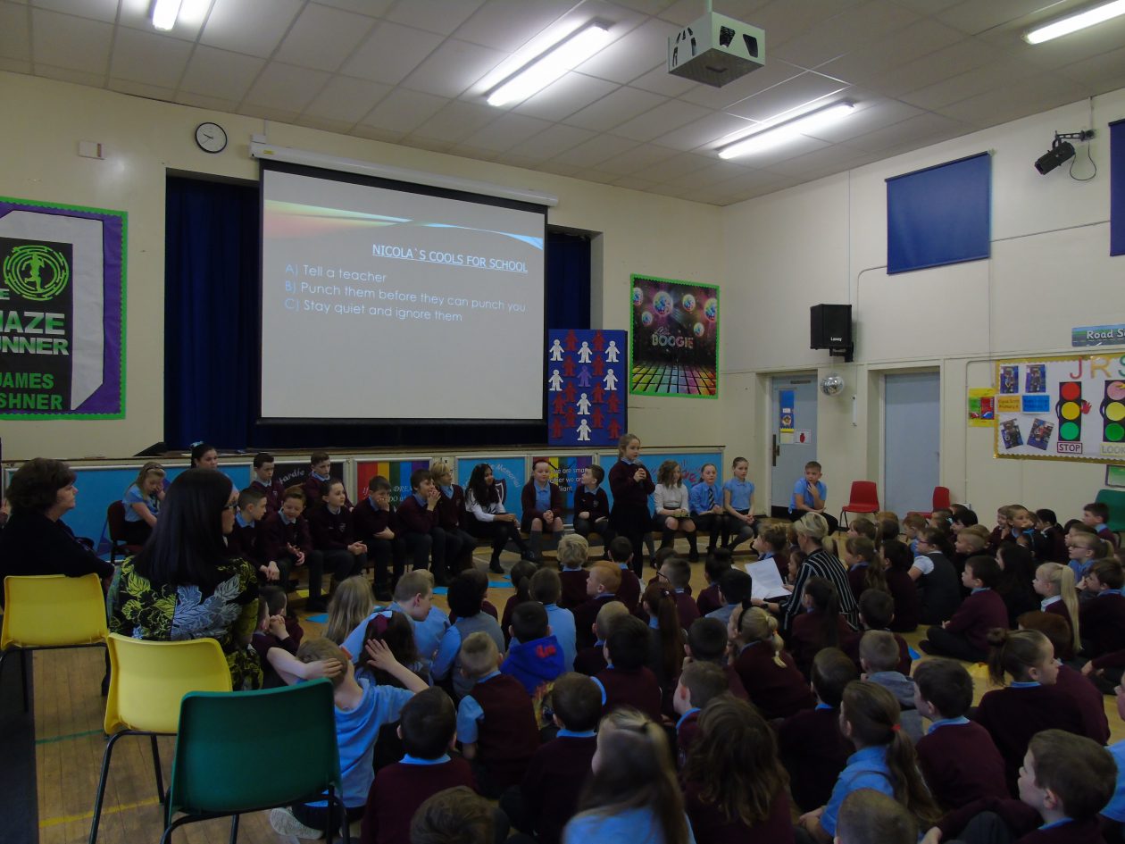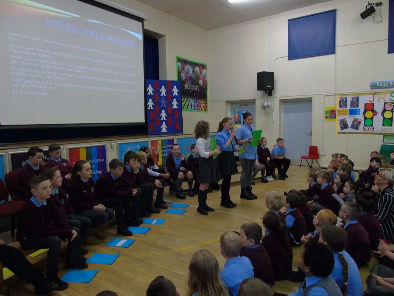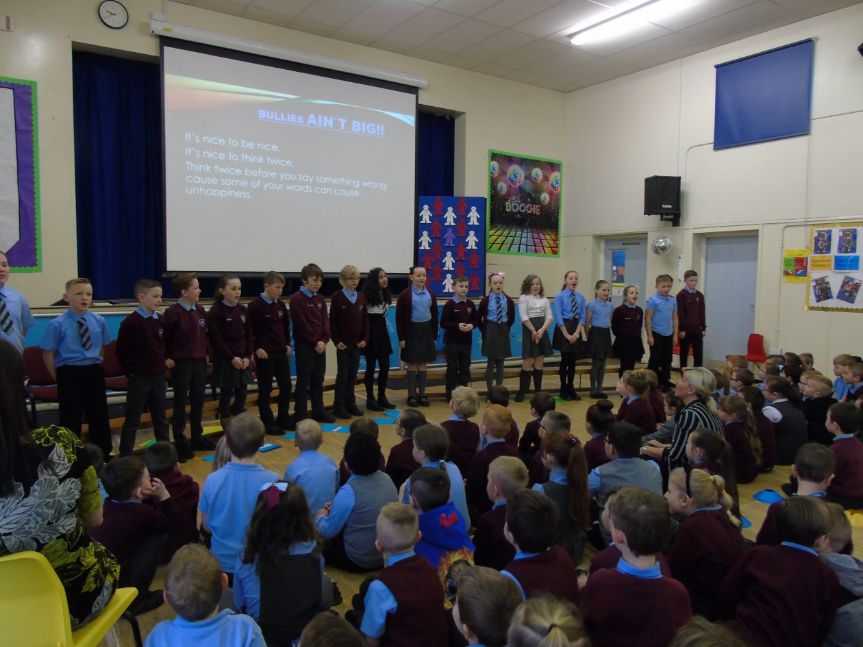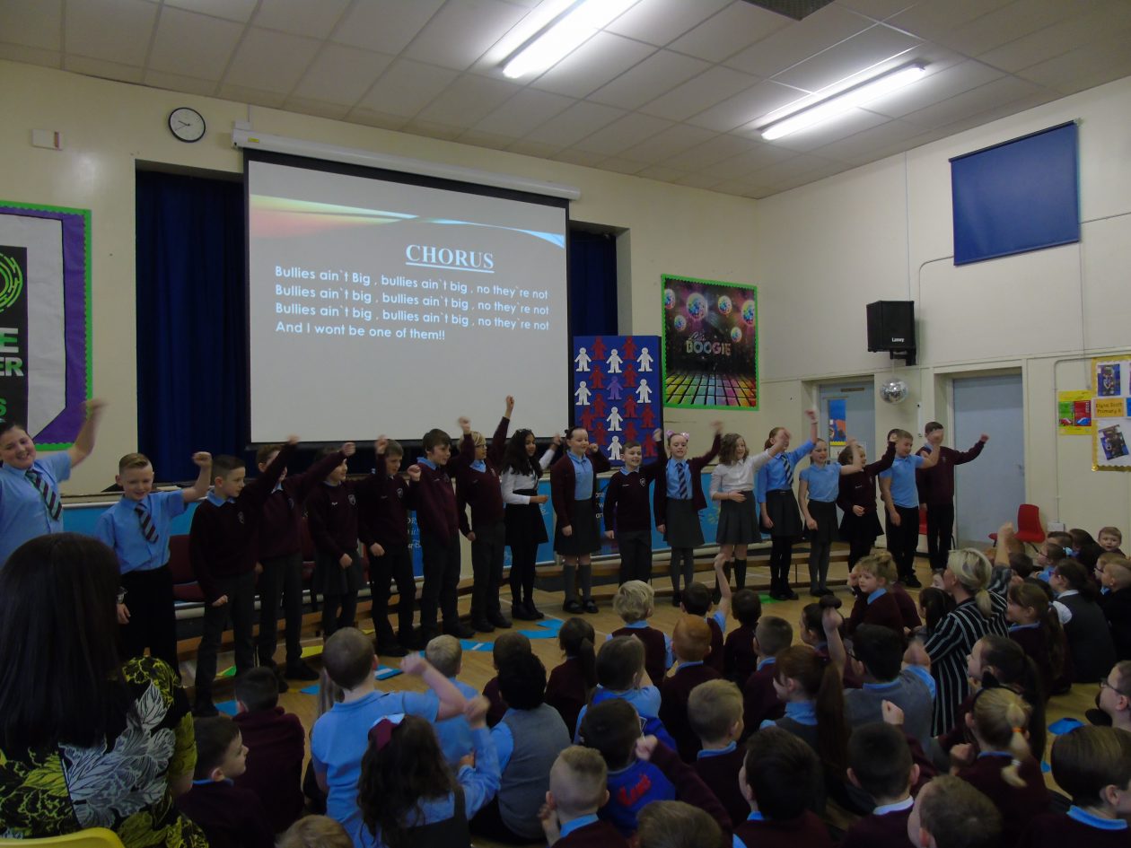 This morning we welcomed family and friends of Primary 6 to our Anti-Bullying Assembly.  Primary 6 delivered a very important message of what bullying is and how we can best deal with situations when they arise. They shared with us different forms of bullying and how it can affect people.  The message was presented in a very entertaining way with songs, poems and interactive anti-bullying scenarios.