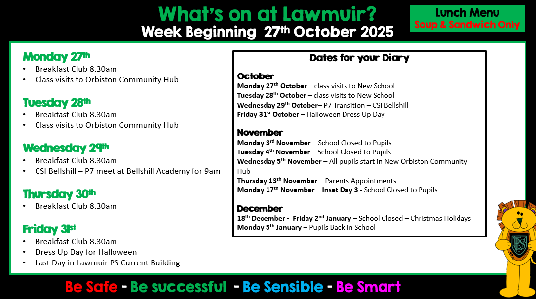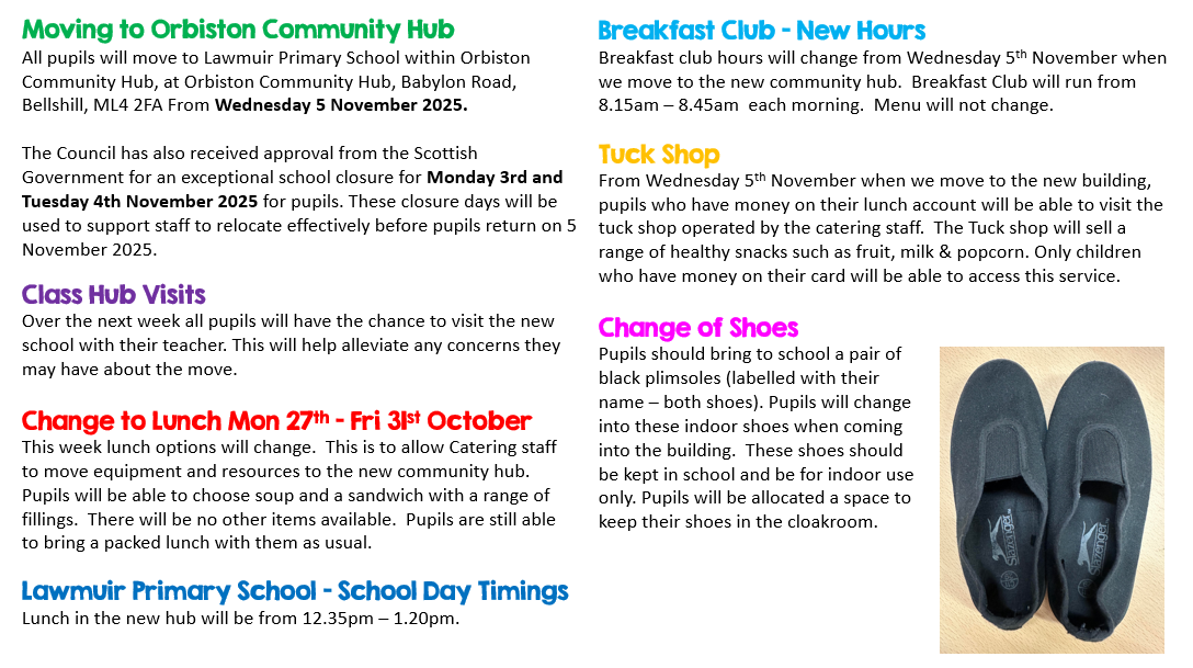 The Council has also received approval from the Scottish Government for an exceptional school closure for Monday 3rd and Tuesday 4th November 2025 for pupils. These closure days will be used to support staff to relocate effectively before pupils return on 5 November 2025.