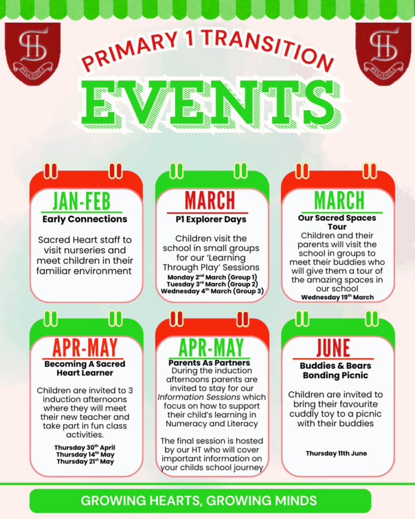 We’re delighted to share our P1 Transition Events Calendar with you. Each event has been thoughtfully planned to give children and their families a smooth, enjoyable, and comprehensive introduction to life at our school. From first visits, to fun, confidence building activities, our programme has been designed to help every child feel comfortable, excited, and ready for their new P1 adventure.