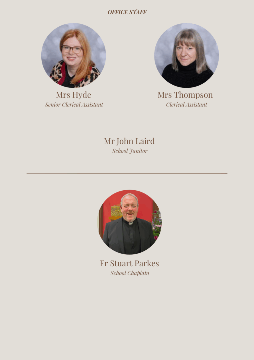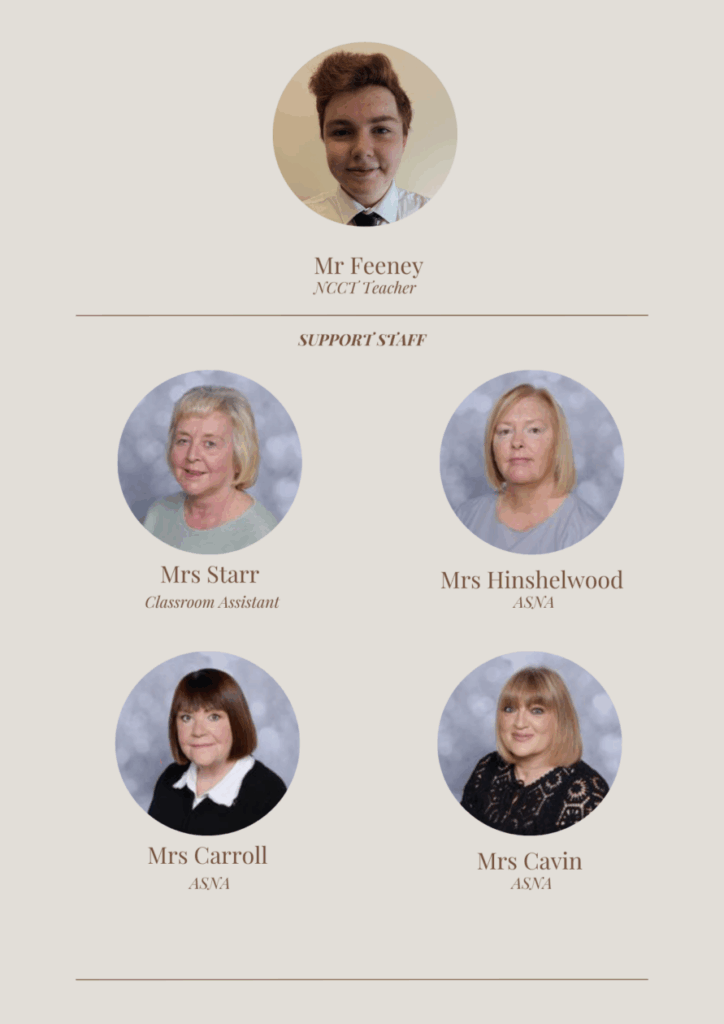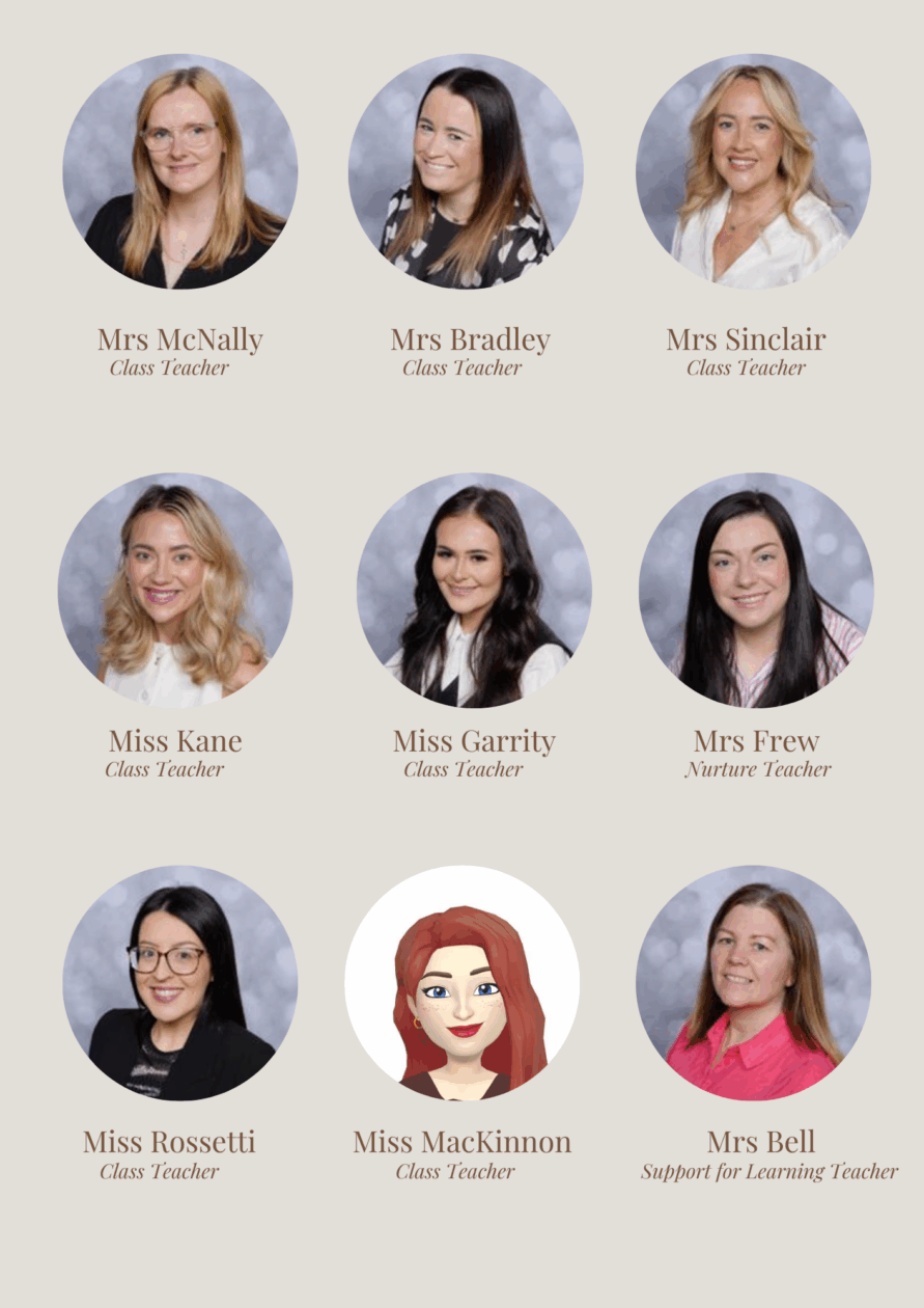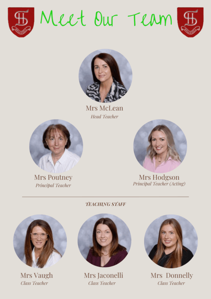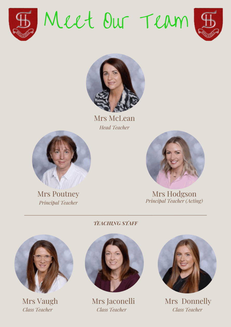 Staff 25/26 Classes 2025/26 Primary 1a Mrs Jaconelli Primary 1b Mrs Vaugh Primary 2 Mrs Donnelly Primary 3 Mrs McNally Primary 3/4 Mrs Bradley Primary 4/5 Mrs Sinclair Primary 5/6 Miss Kane Primary 6 Miss Garrity Primary 7 Mrs Hodgson/Mrs Poutney