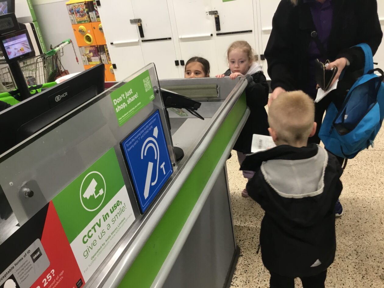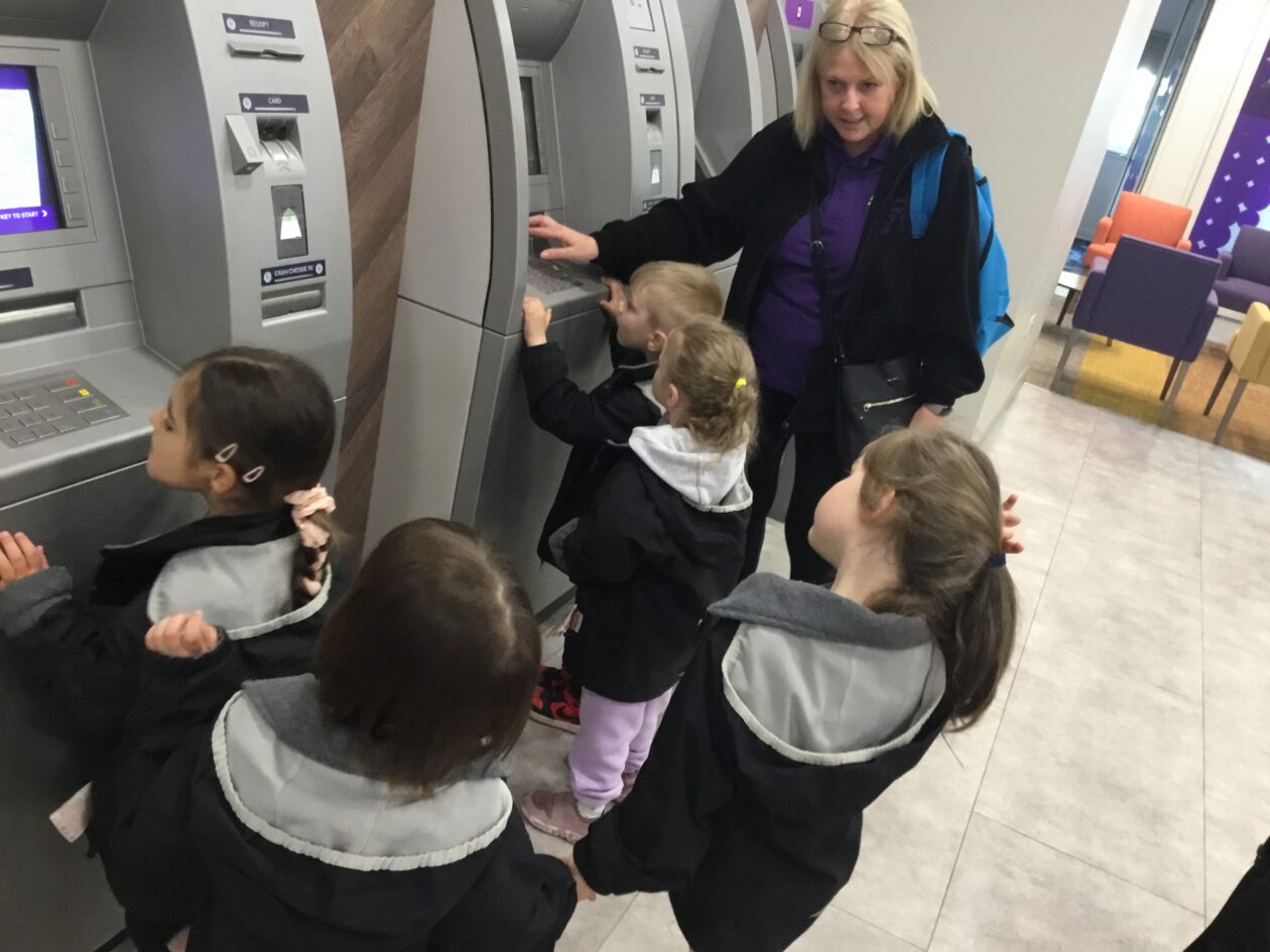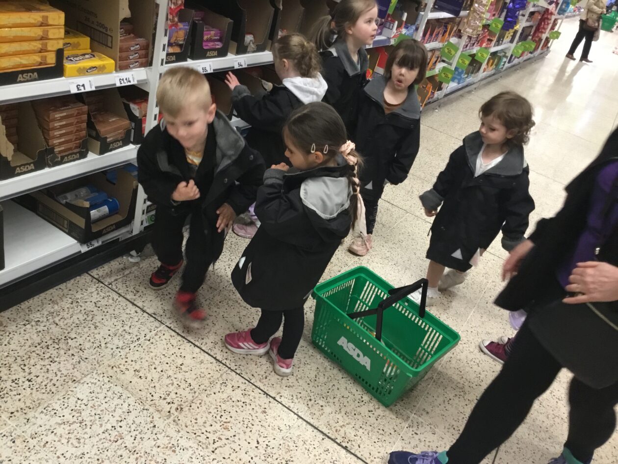 The nursery children have been learning about money. We had a lovely morning, we went on the bus to Coatbridge and we visited Asda and did some shopping, then we went to the bank.