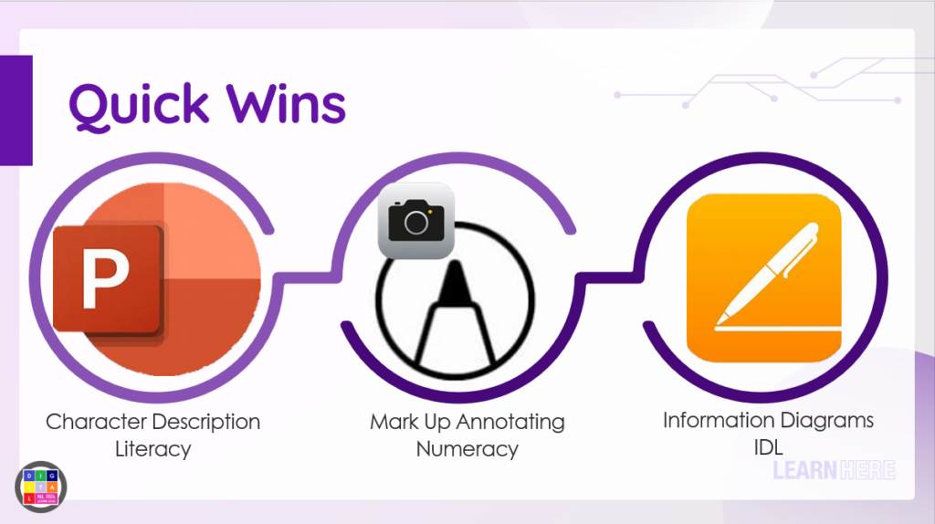 allow teachers the choice and freedom in their own planning. Apps and software such as PowerPoint, Keynote, Pages, Word, Excel, Numbers, MarkUp etc are adaptable and easy to use.