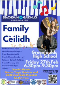 On Friday Night we were delighted to be able to host the North Lanarkshire Family Ceilidh as part of World Gaelic Week. This was supported by NLC, CLD and Bhord na Gaidhlig. On the night we had a range of performers including some amazing young people who are future, current and ex-pupils including the Tollbrae Nursery Class, Isla Duke, the school trad band and the Mod Gold Winner Caitlin Yule. With over 170 young people and families in attendance it was a great night and a wonderful opportunity to celebrate the Gaelic Language and Culture.
