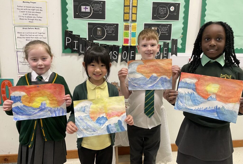 Mr Young was super-impressed with the artwork of these Primary 3 learners on Thursday 13th February. Their class are learning about famous artists and were inspired by the painting ‘The Great Wave’ by Japanese artist, Hokusai. Our young artists used pencil to create the lines and shapes of the waves, sea and sky and then added colour and tone using watercolours. The beautiful paintings wouldn’t look out of place hanging on a Primary 7 classroom wall!