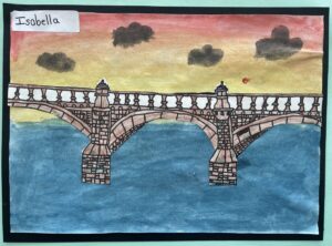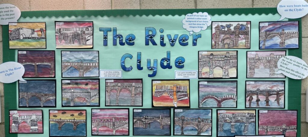 Our Primary 5 learners’ observational line drawings of Glasgow bridges were created using felt pen and watercolour before being cut out and mounted on painted backgrounds of warm and cold colours to give the feel of different times of day along the River Clyde. Mr Young was particularly impressed by the level of detail on each bridge.