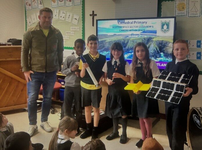 Cathedral parent and international trade specialist with the Scottish Space Programme, Andrew Dickson, delivered an exciting presentation on space to our Primary 5 learners on Friday 31st October. The children learned how satellites and rockets are designed and launched right here in Scotland, and even had the chance to hold a satellite prototype from Skyrora and touch part of a rocket that has actually been to space!