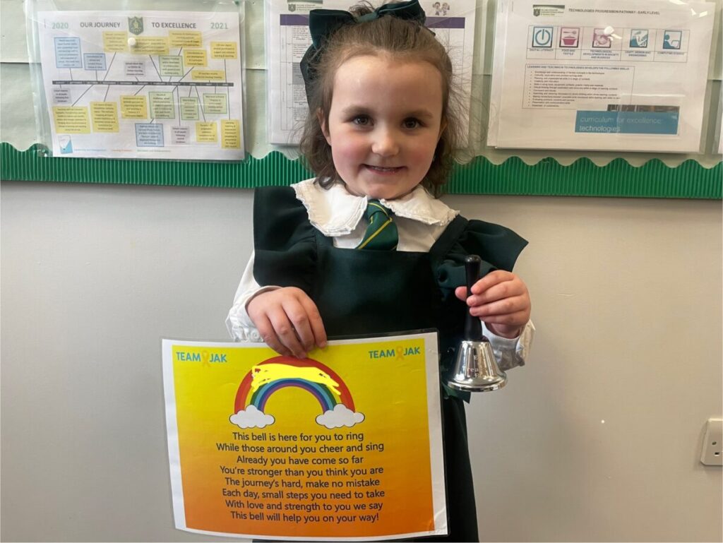 Recently, she reached a very important milestone and was able to ring her End of Treatment Bell — a moment of joy and relief for her and her family. She rang the bell once again at Cathedral’s weekly assembly, where the whole school joined in with cheers, applause and huge smiles!