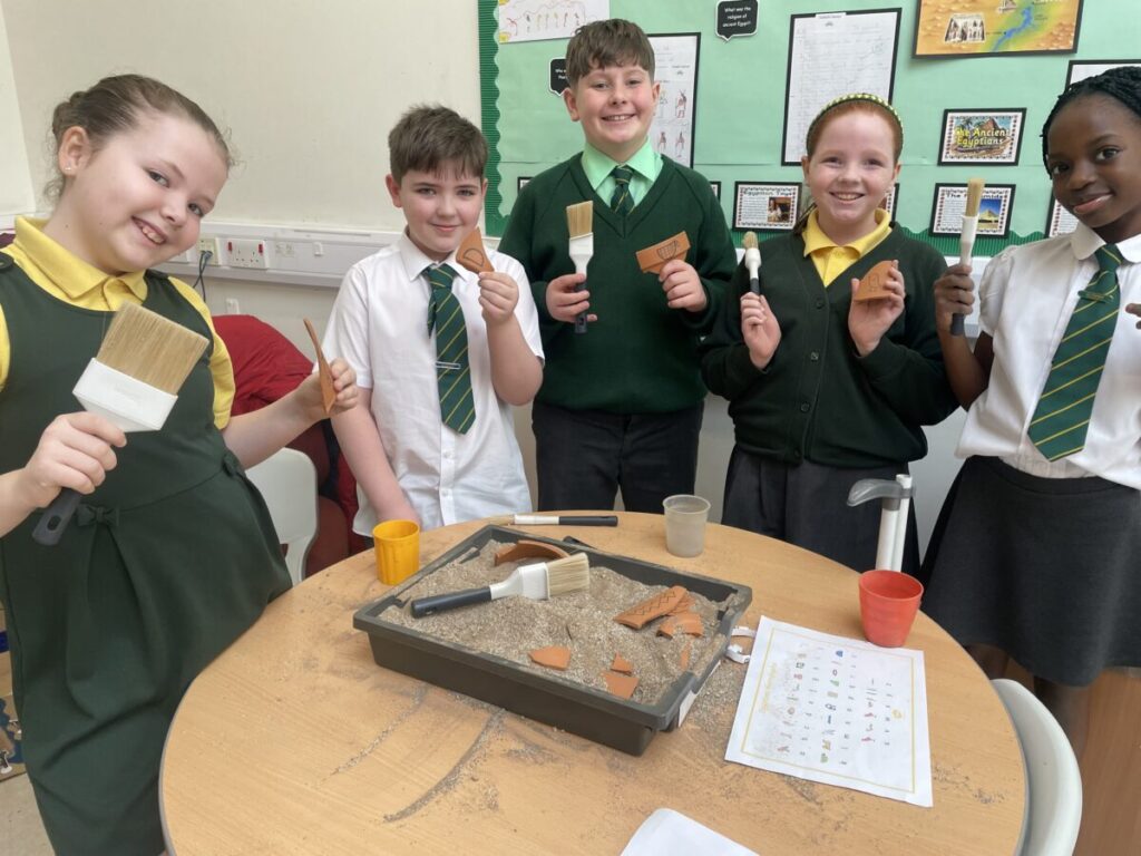 Mr Young came across a fantastic learning activity in Winners Wynd on Tuesday 10th March. As part of their topic on the Ancient Egyptians, these young Primary 6 archaeologists were busy digging through sand to uncover fragments of pottery. Each piece revealed a hieroglyph, which they then had to piece together to crack a secret code: ‘Tutankhamun 1332 BC’—the year he became Pharaoh.