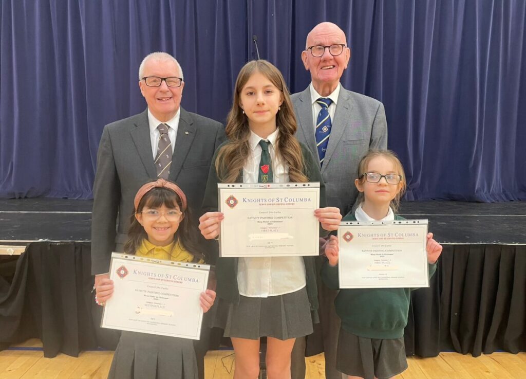 Cathedral Primary was delighted to welcome Mr Jack Rafferty, Grand Knight of KSC Carfin, and Mr Michael Roche from KSC Action and Youth on Monday 19th January. They joined Cathedral school community for assembly, where they presented certificates to three of our learners who excelled in last term’s Knights of St Columba Christmas art competition, achieving a 1st and 2nd place in the Junior category and a 1st place in the Senior group.