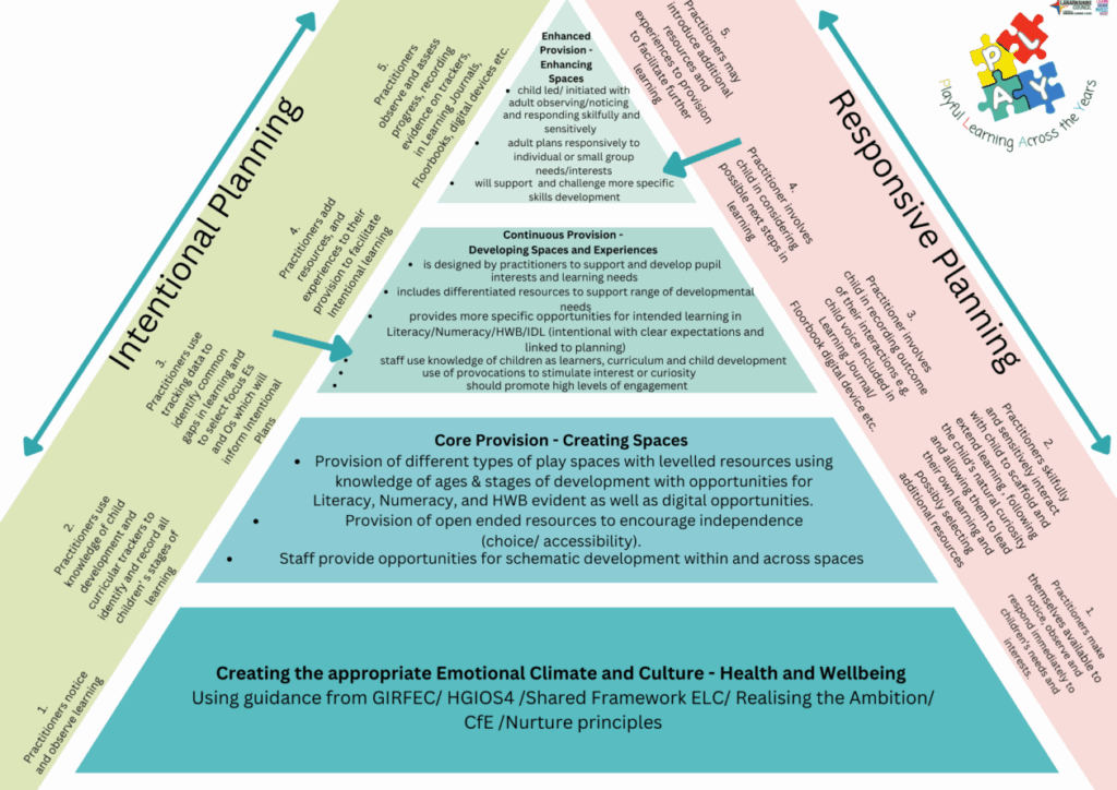 Planning for core learning such as literacy and numeracy would still be planned intentionally in advance. But where in the past forward plans would have reflected a whole terms worth of planning across all curricular areas, when following Play Pedagogy and having the mix of intentional and responsive planning, some of our planning records would be updated retrospectively. It can be useful to have on overview of the Experiences and Outcomes that can be highlighted and annotated as the practitioner responds to the interests and needs of the children.