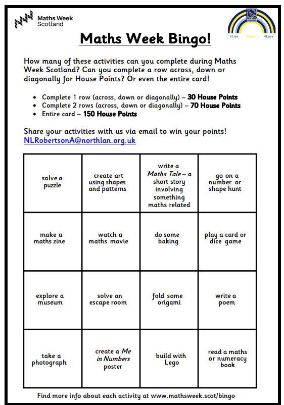 Earn some House Points by taking part in our Maths Week 2025 bingo challenge!