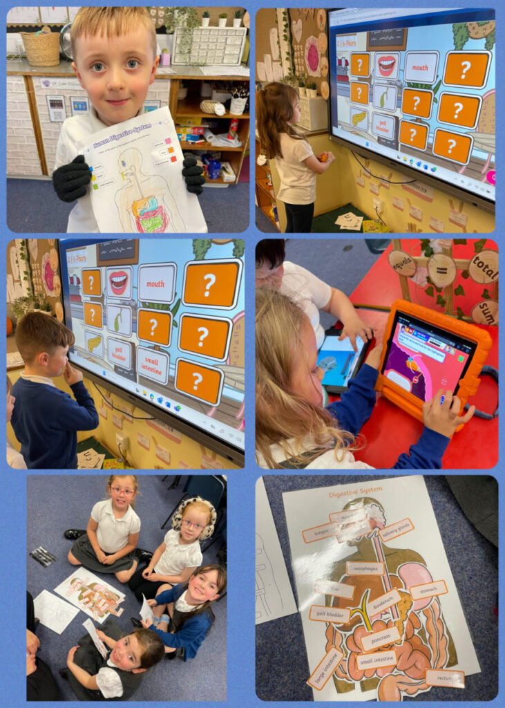 This week, Primary 2 continued their learning about the human body and we learned all about the digestive system. We learned the scientific names for the parts of this system and practised using them through playful activities. Today we demonstrated how the digestive system works with a science experiment, ask us all about it!