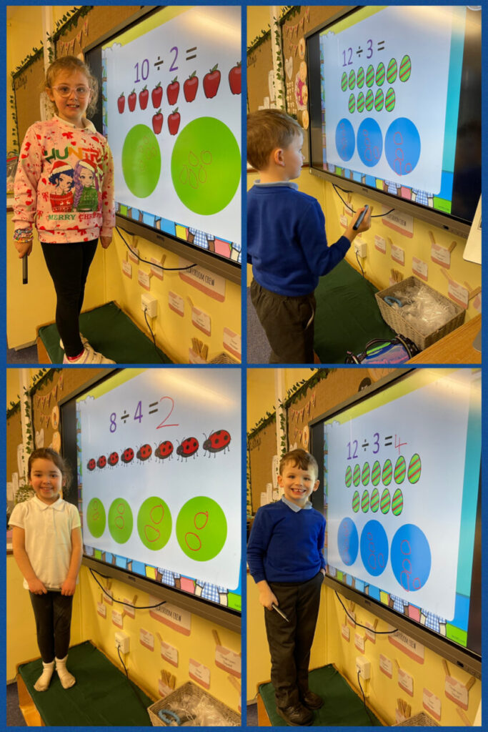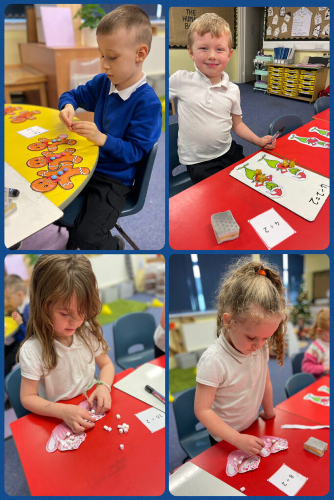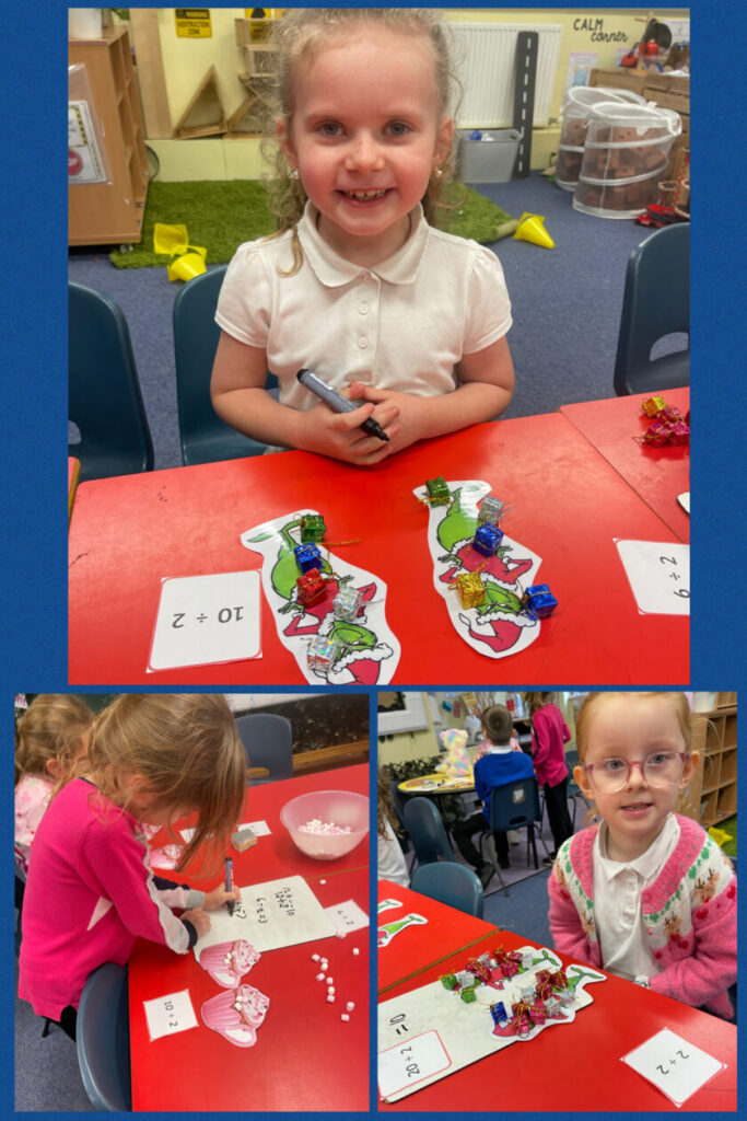 Primary 2 have started learning about division. We used the equal groups strategy to share objects equally with nothing left over. We added a Christmas twist to our activities and shared presents between the Grinches, marshmallows between the hot chocolates and buttons between the gingerbread.