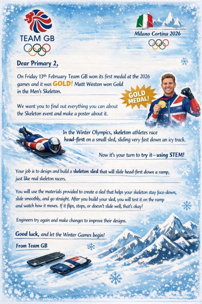 On Monday, Primary 2 were delighted to tell me that over the weekend, Team GB had won, not 1, not 2, but 3 medals at the Winter Olympics and they were all GOLD! We got a special letter from Team GB with a challenge to learn all about the Skeleton Event. We learned so many facts and then designed and tested our own sleds. Did you know that Skeleton athletes can reach 80-90mph down the ice track?