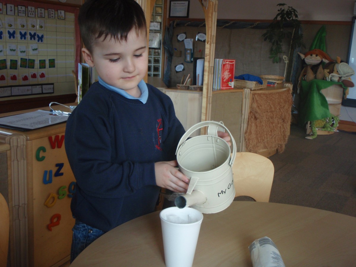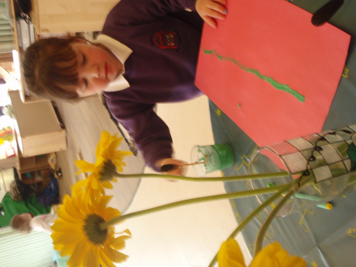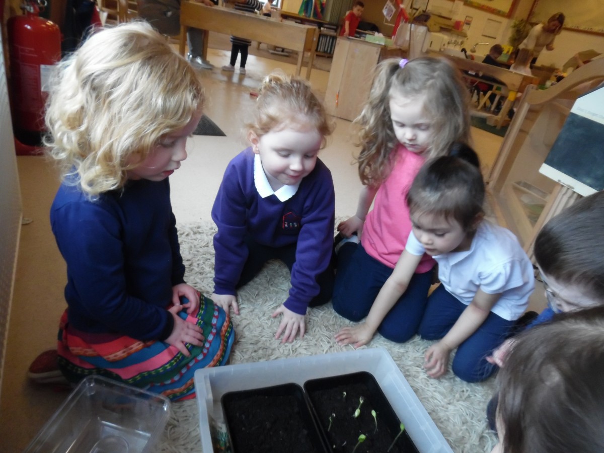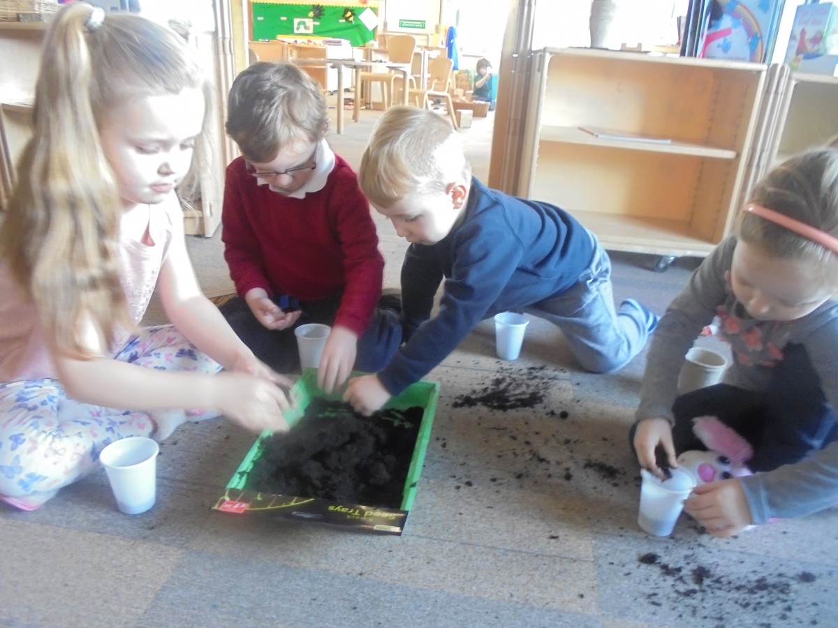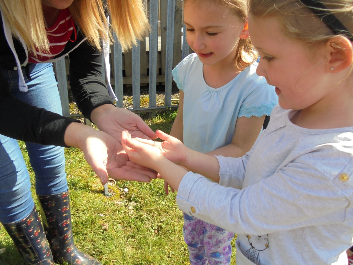 Children within the 3-5 playroom have returned from the Easter break full of energy and ready to learn. With the welcomed appearance of the sun and the temperatures rising the children have been even more motivated to explore the outdoor environment where they are discovering the sequence of how living things grow and develop as they plant seeds and learn what they need to survive. Going on bug hunts using magnifying glasses has introduced the children to size and amounts as they discover the interesting creatures that live in our garden, information books have provided further knowledge on these topics and helped the ladies to answer the many questions asked. Within the playroom these interest have been supported as children can recreate the images they have seen including flowers and mini beasts using a range of media. Jigsaws, table top games, small world resources and Smart Board programmes have been used to enable children to researching within a variety of ways.