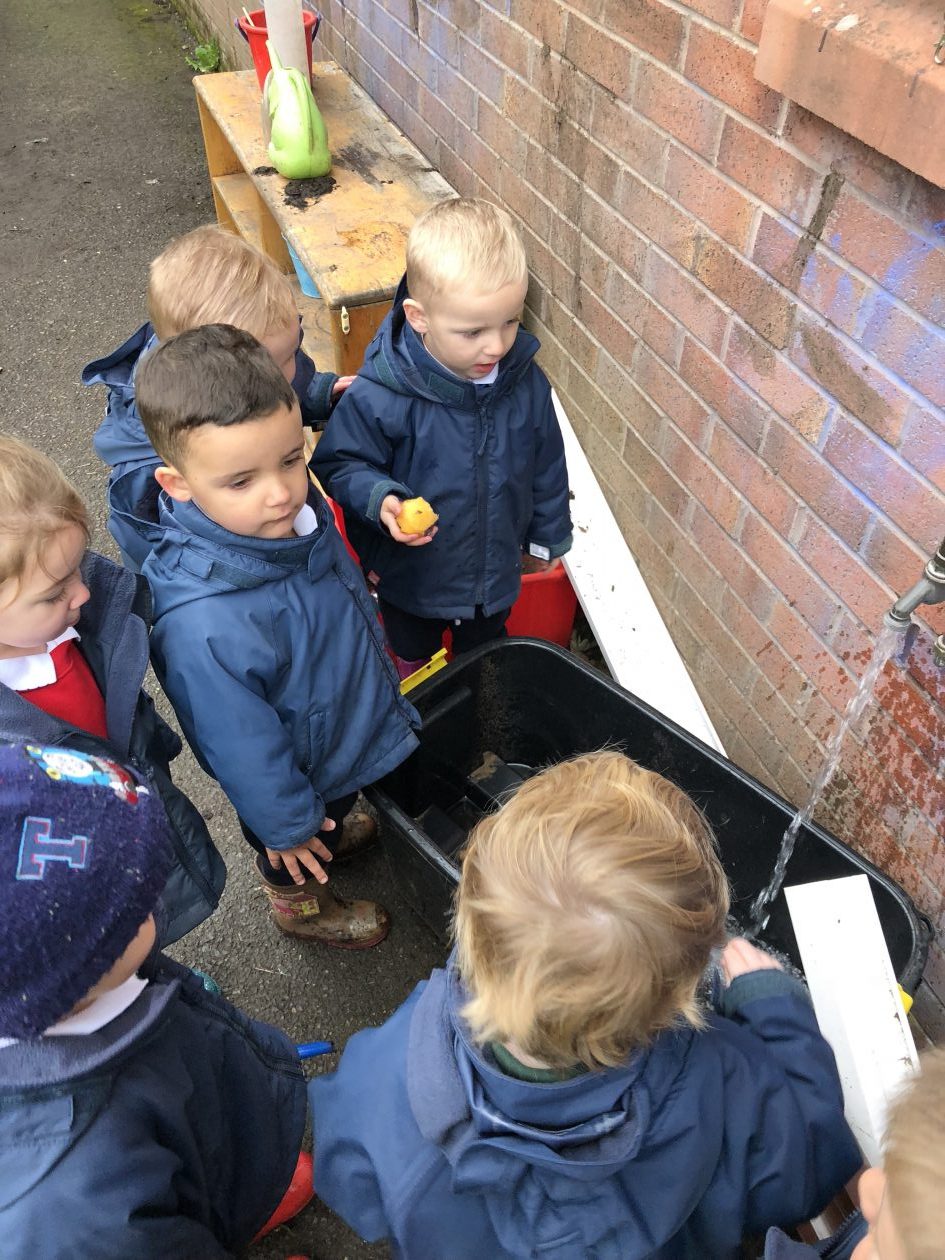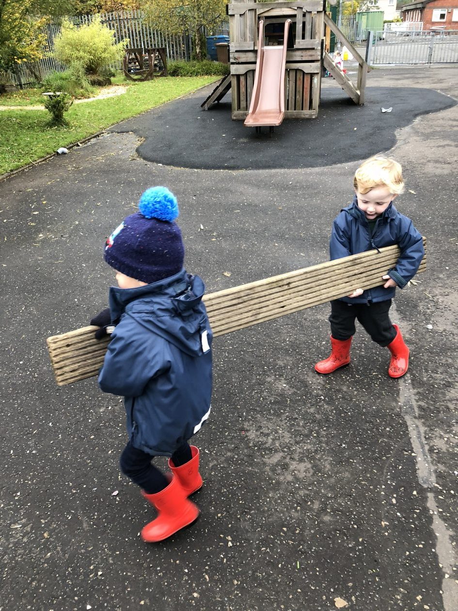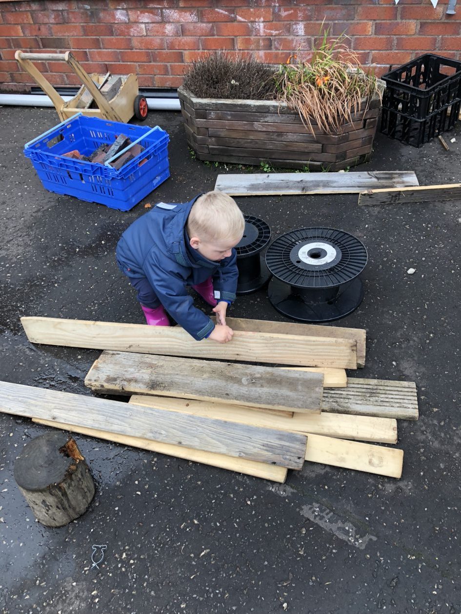 The wet weather has provided opportunities for play in the mud kitchen where the children have been exploring the texture of the mud, using the utensils to add more water to jump in, paint with and be creative with. Working together the children have used the loose parts on offer such as long pieces of wood to build ships, bridges and many other wonderful creations.