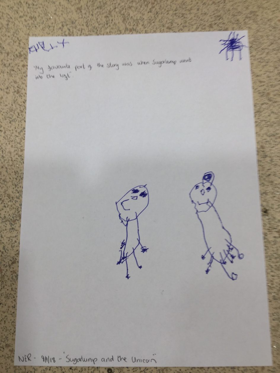 Through the Three Read Approach to Literacy programme, Nurturing Early Readers, Nicola’s group have been reading Sugarlump and the Unicorn. They have explored the characters, setting and the problem. Through their illustrations they have been able to share their favourite part.
