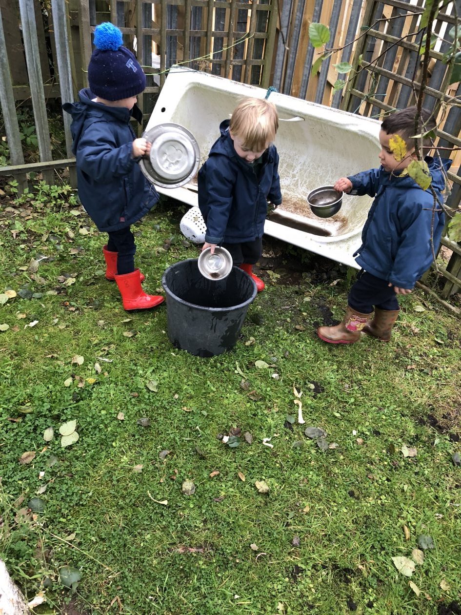 The children continue to use the outdoor learning opportunities daily regardless of the weather. The only problems encountered is that many of the children do not have spare clothes in their nursery bags when they get wet. It would be great if you could check to make sure your child has a full set of clothes in their bag.