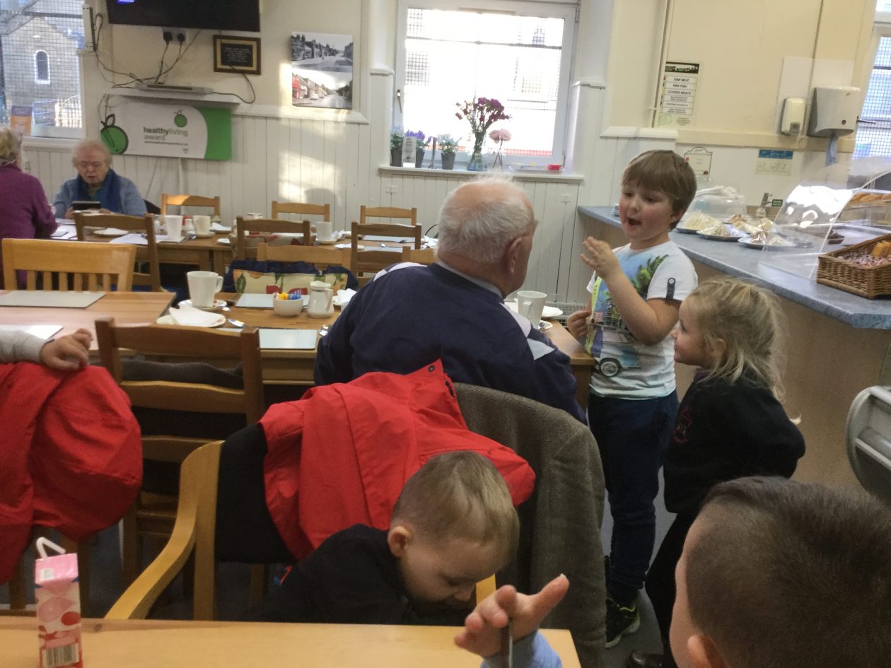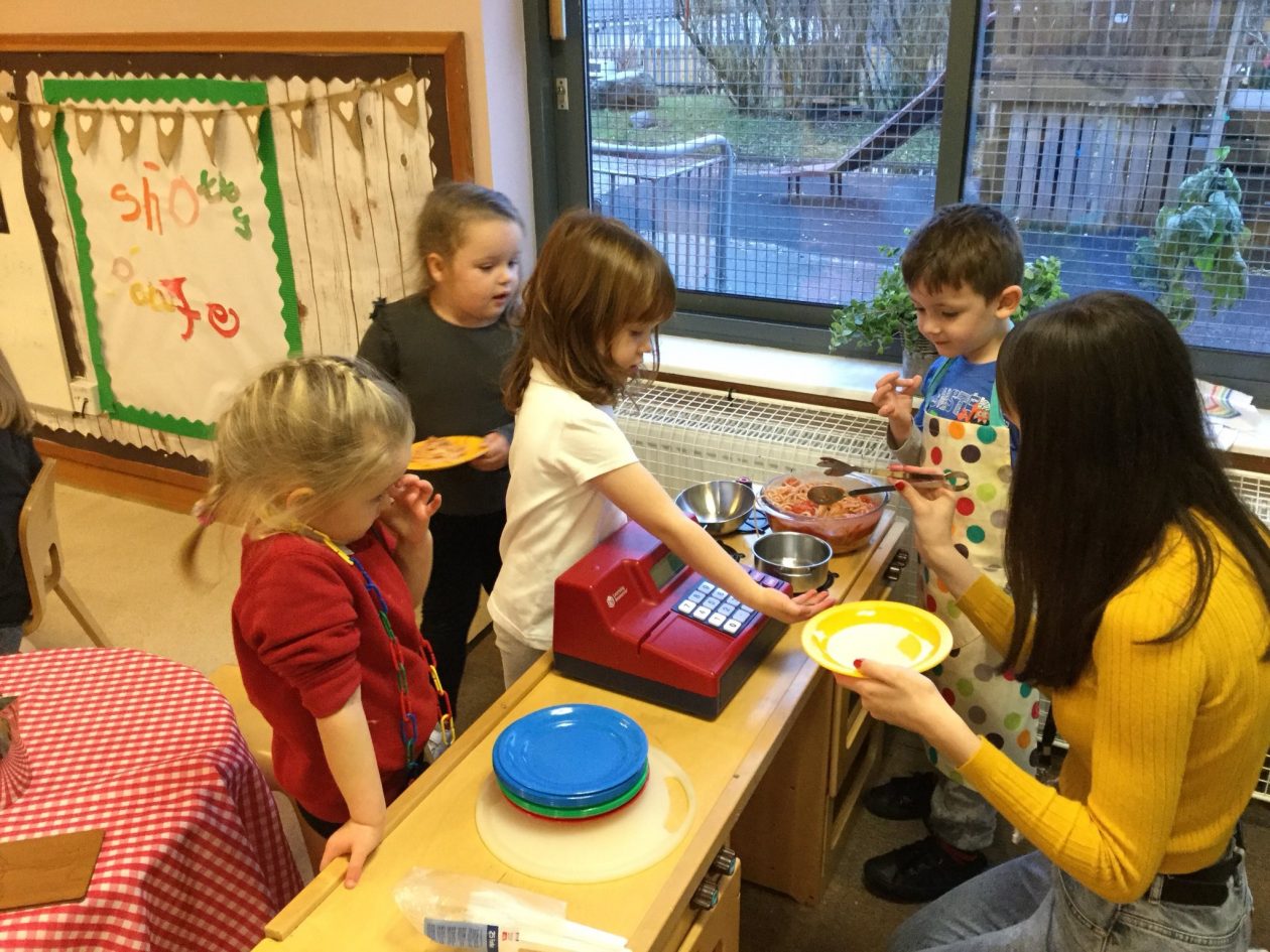 Developing coin recognition in a playful way began with the creation of Shotts Nursery Shop, selling a variety of goods, however this very quickly changed into designing and planning for various foods to be sold in their new Café. Throughout this process the children, cooperated with one another,shopped and made their own foods, developed their early mark making skills whilst taking orders but above all they were learning through real life contextualised play. The children have been visiting local eateries, planning their journey, ordering from the menus and making new aquantencies in the community. And what a lovely gesture to have some homemade Romanian cake when the Cafe turned into a cake and coffee shop. It really was truly delicious.