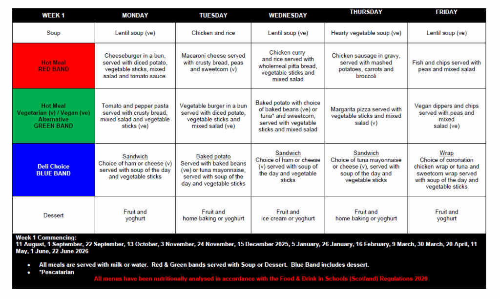 | Friday | Fast Food Lunches Red – Chicken Goujons Wrap Green – Toasties Sandwiches – cheese and ham |