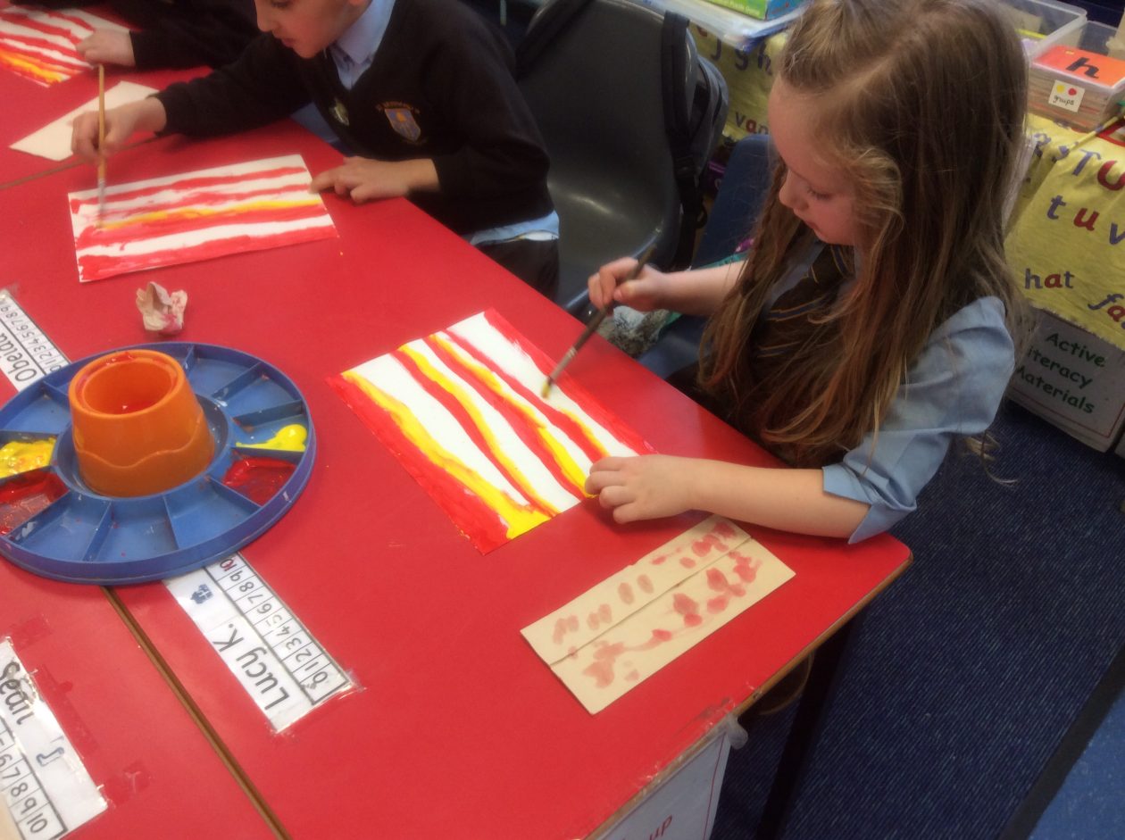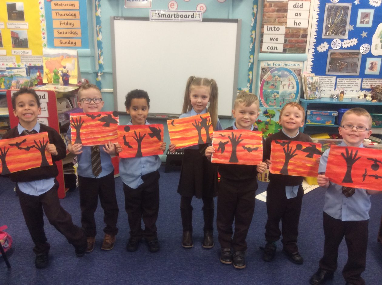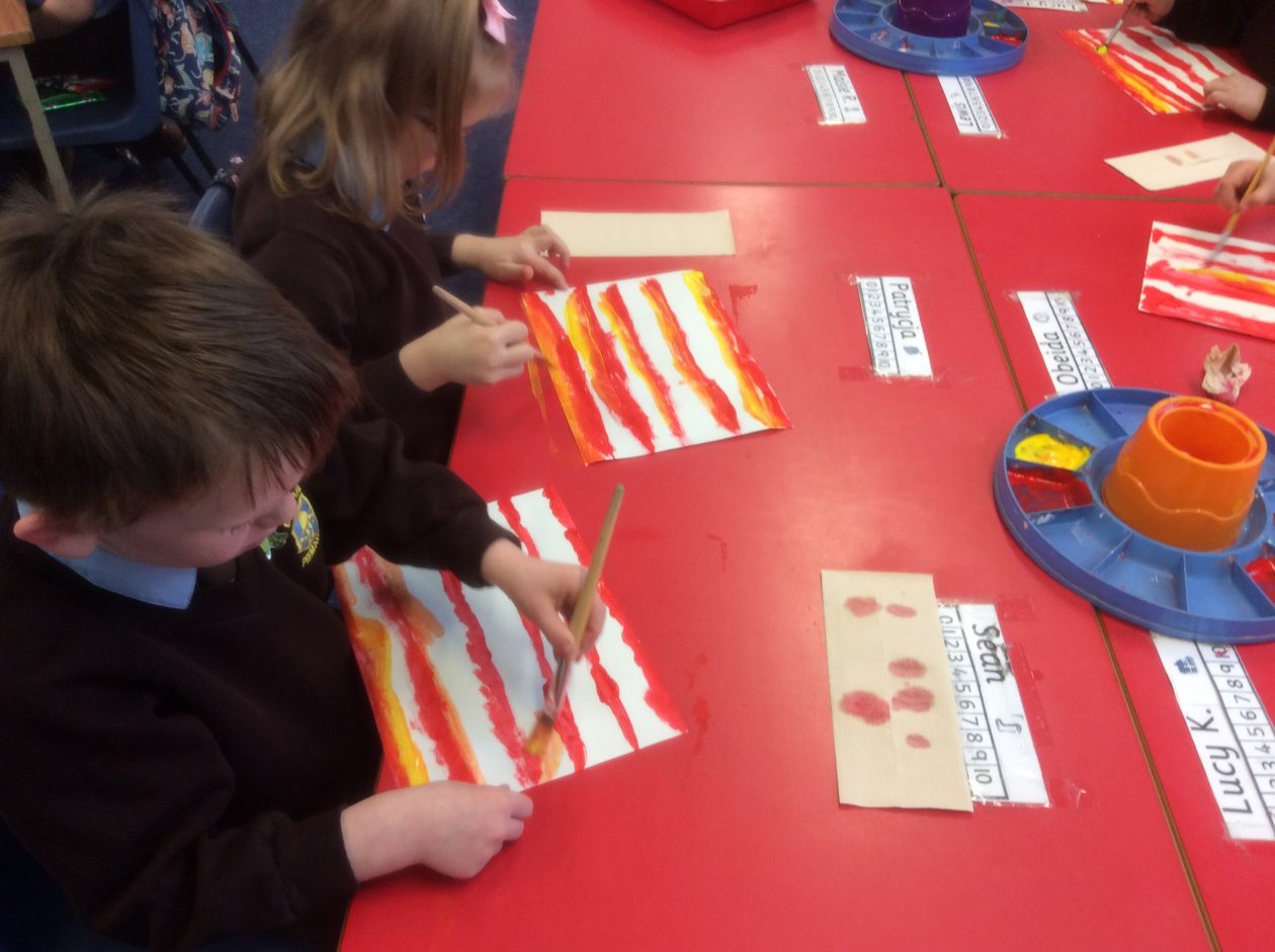 We created a sunset sky using red and yellow paint. We added silhouettes of birds, trees etc to make a lovely sunset picture.
