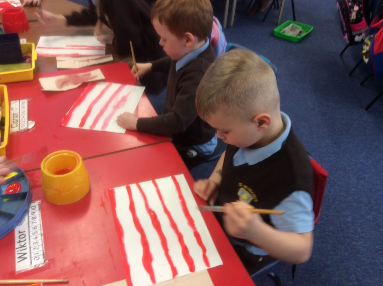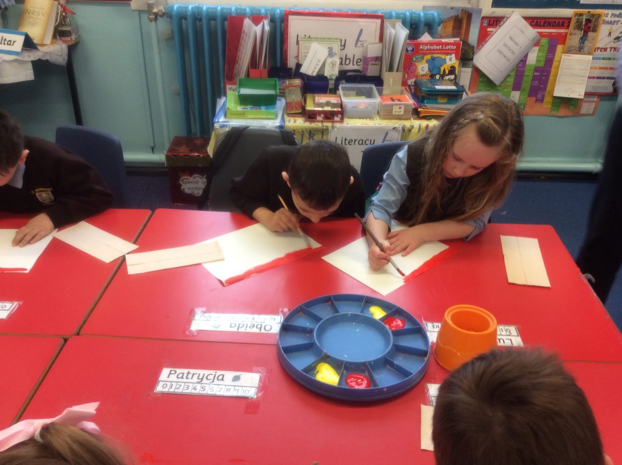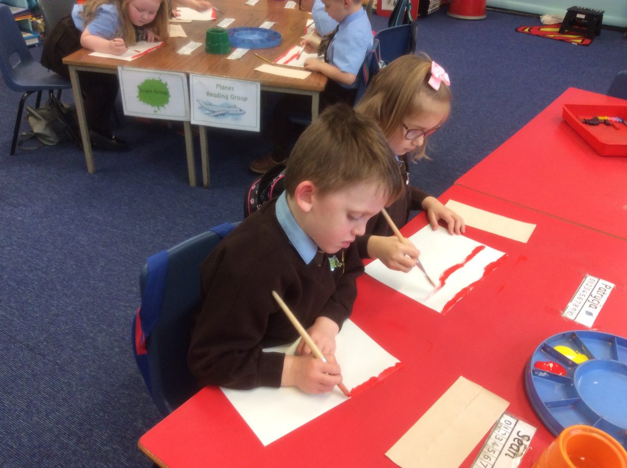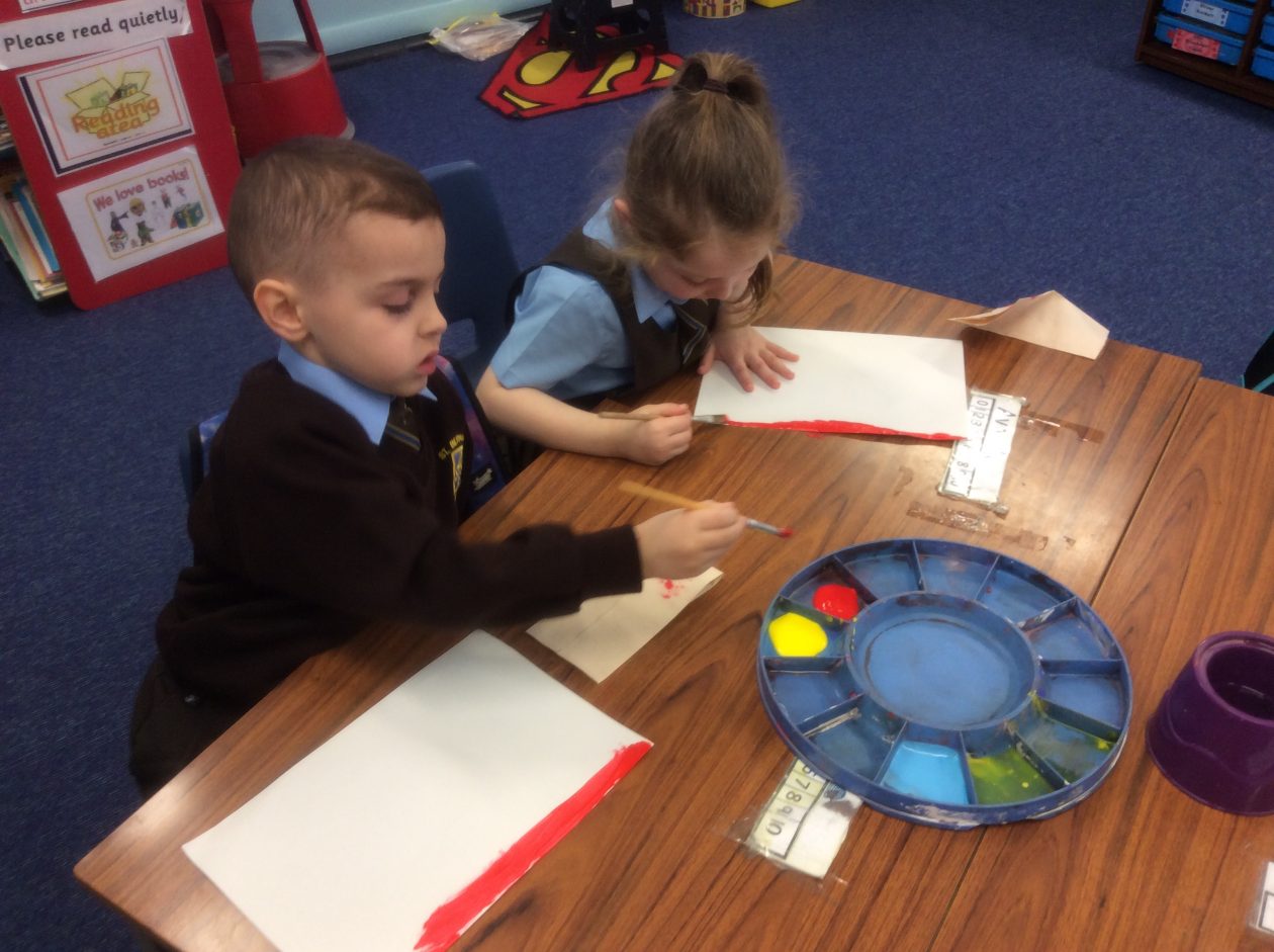 We created a sunset sky using red and yellow paint. We added silhouettes of birds, trees etc to make a lovely sunset picture.
