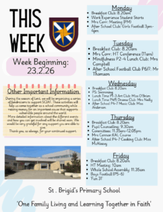 Next week, we will be collecting toiletries to support St Vincent de Paul’s Annual Appeal through St Brigid’s Parish.