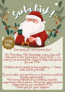 We’re excited to announce that our Sponsored Santa Dash will take place on Thursday 11th December. Each class will enjoy a festive dash around the school grounds to help raise funds that the PTA uses to provide valuable resources, equipment and enrichment opportunities for all our children.