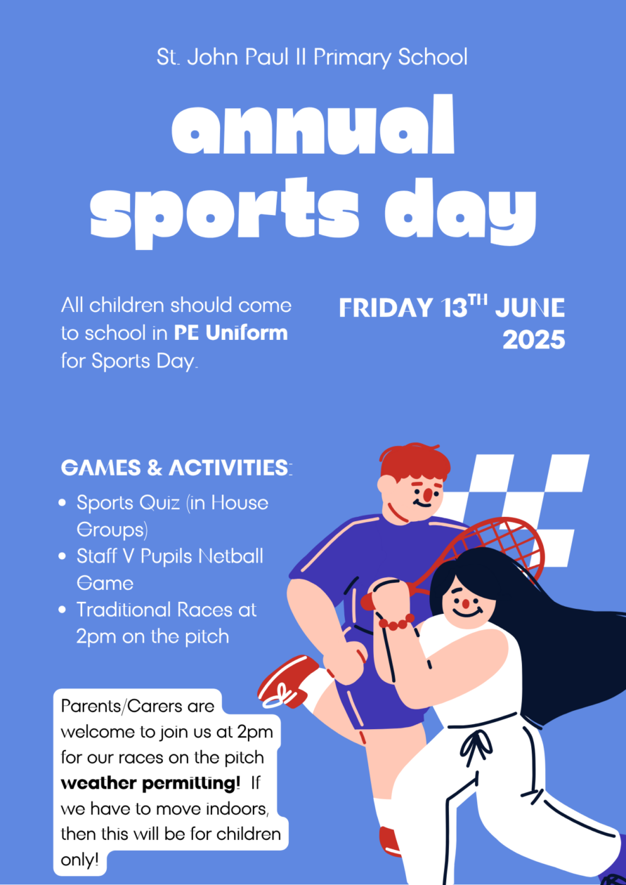 You may remember from a previous Newsletter, that we have changed our approach to what was our annual Health and Wellbeing Week. Instead of squeezing lots of activity into one week, we have spread this throughout the school year. More recently there have been coaches in school offering different experiences and taster sessions. However, we are still holding our annual Sports Day. Please see below for further information.