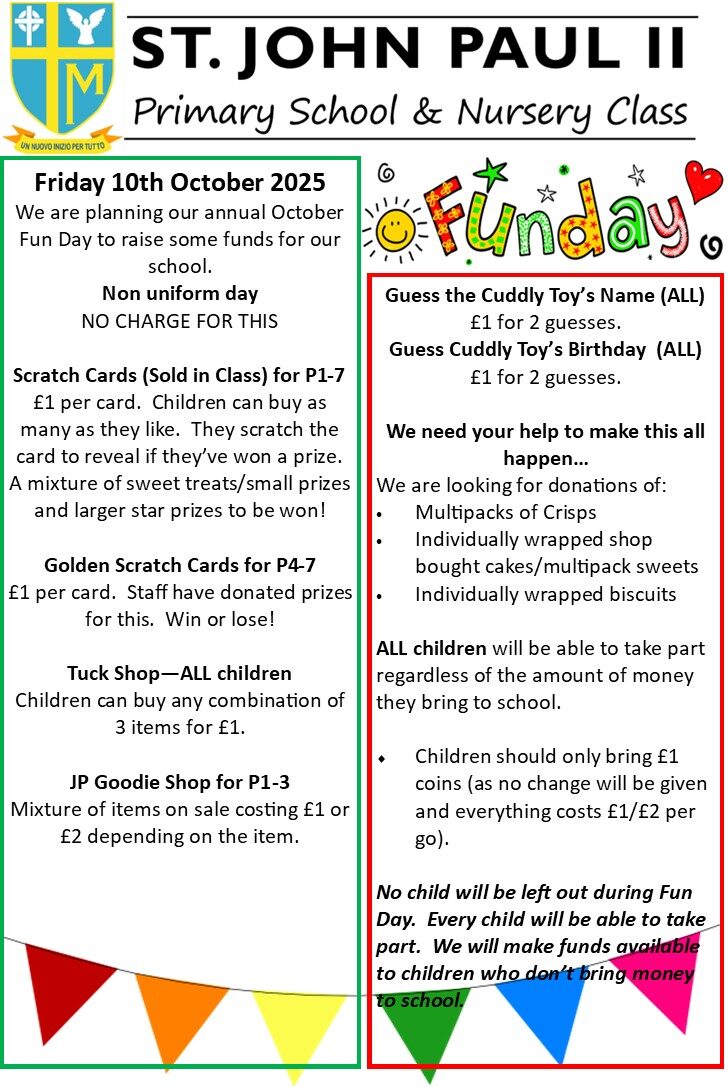 Please see the flyer below which gives information about our upcoming Fun Day. We are looking for some donations for a Tuck Shop which will run throughout the day. Details are below. Nothing which contains nuts.