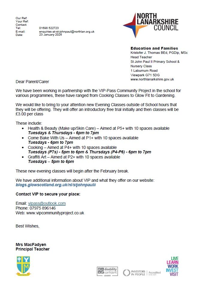 The VIP-Pass Community Project have Evening Classes coming up for out of School hours: