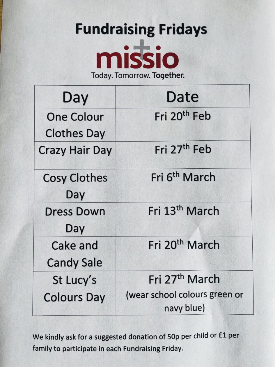 Missio Scotland February 19, 2026 by Miss McCarthy | 0 comments We will be supporting Missio Scotland during our Lenten Appeal this year. Activities begin tomorrow, Friday 20th February. Please donate what you can!