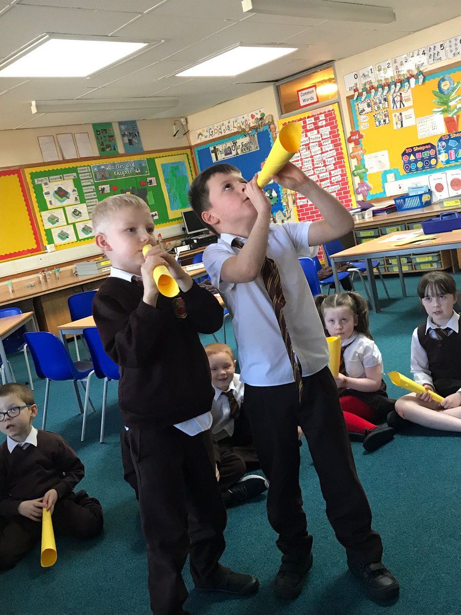 Primary 2a learning about the role of a messenger, making a trumpet and playing whispers.