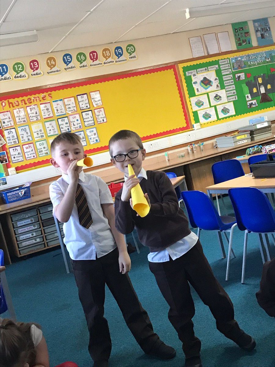Primary 2a learning about the role of a messenger, making a trumpet and playing whispers.