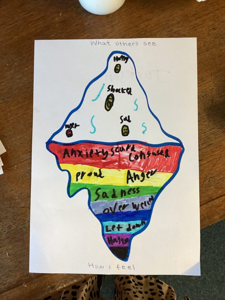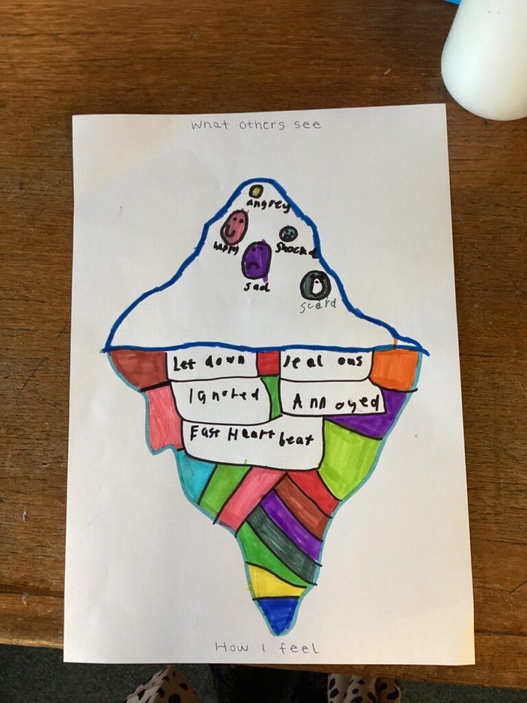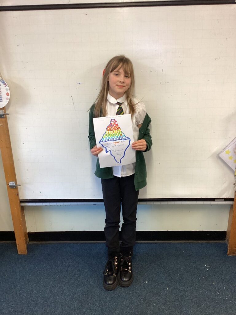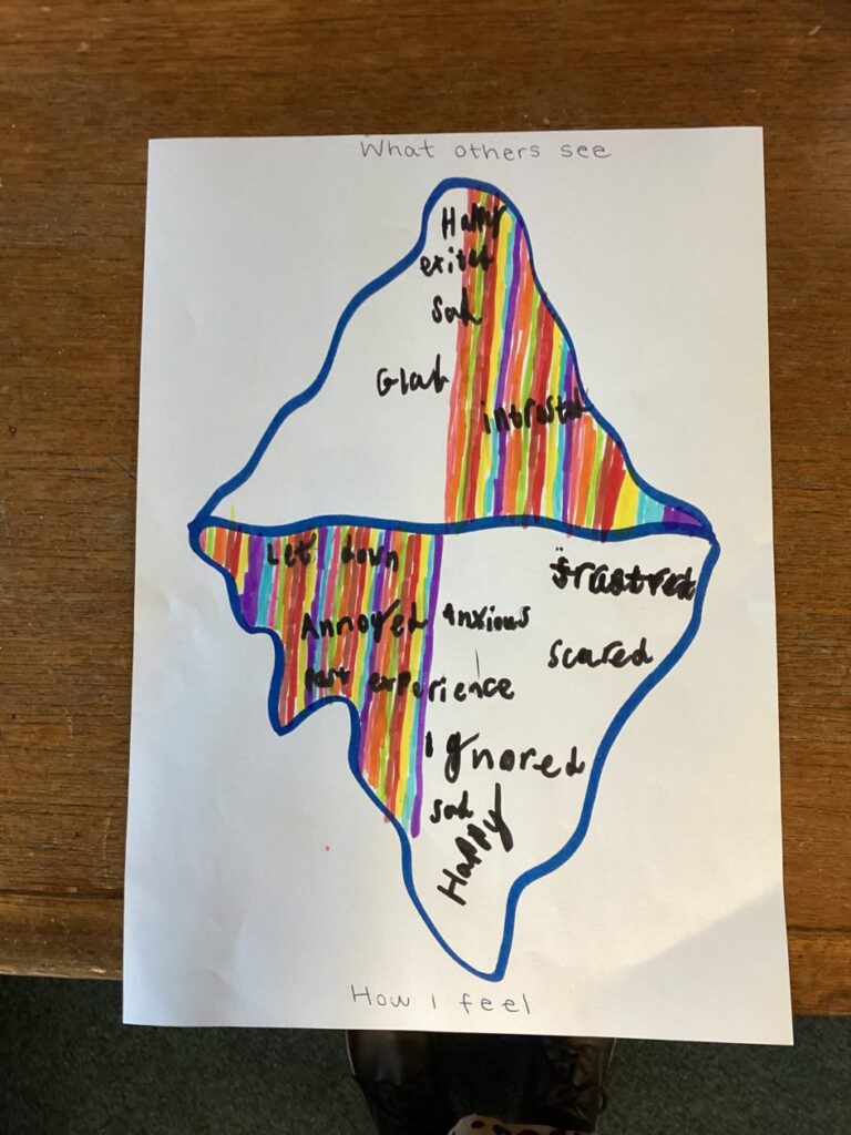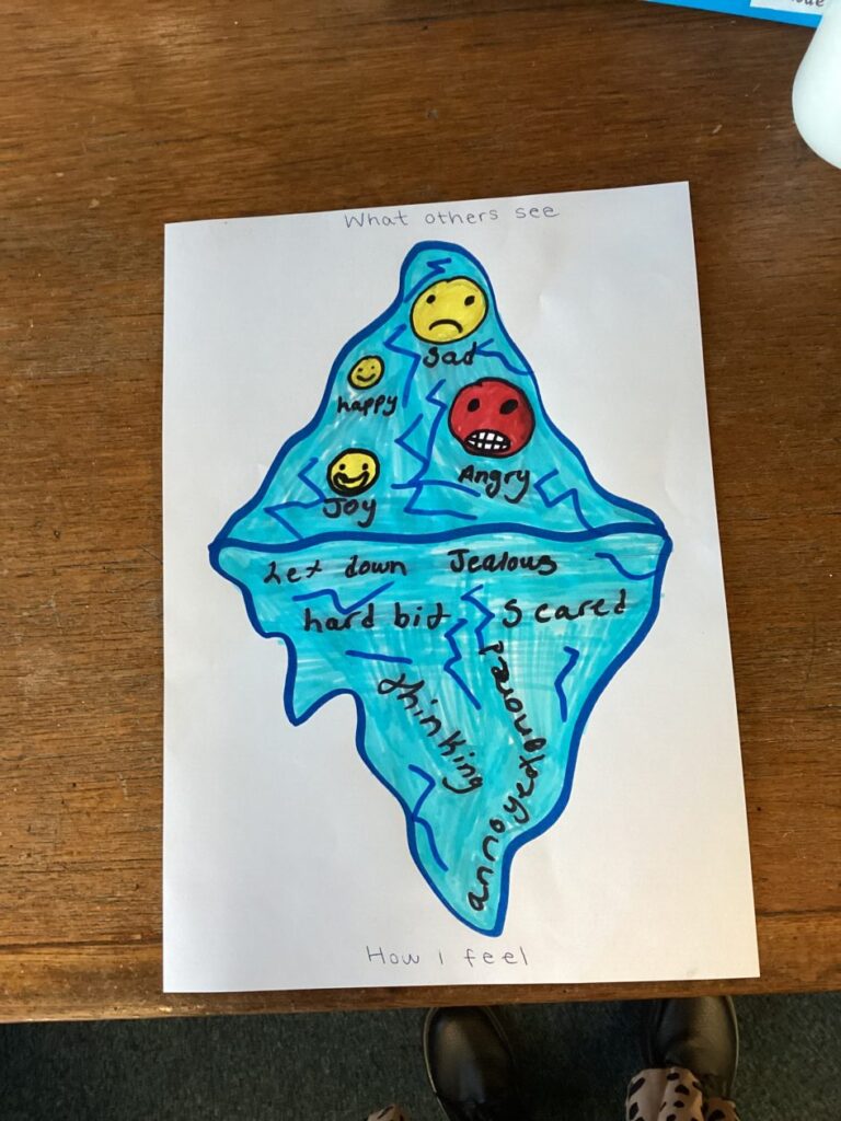 We looked at different emotions and what they feel like. We also thought about what others see when we feel these emotions. Miss Connelly helped us to do this by creating emotion icebergs thinking about hidden and visible emotions. We enjoyed creating these and even played a game of ‘where’s the emoji’ similar to where’s Wally!