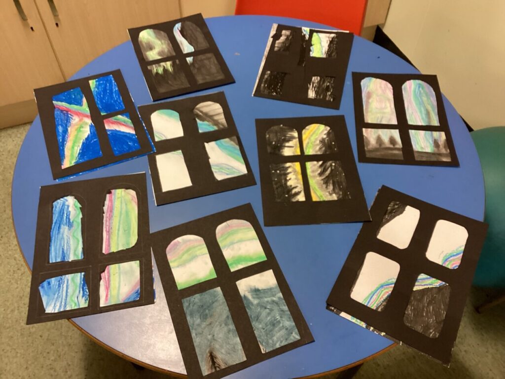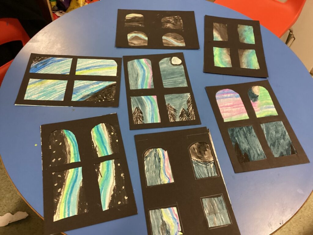 A few examples of this week’s art work – we used blending techniques to create some Northern Lights scenes with oil pastels.