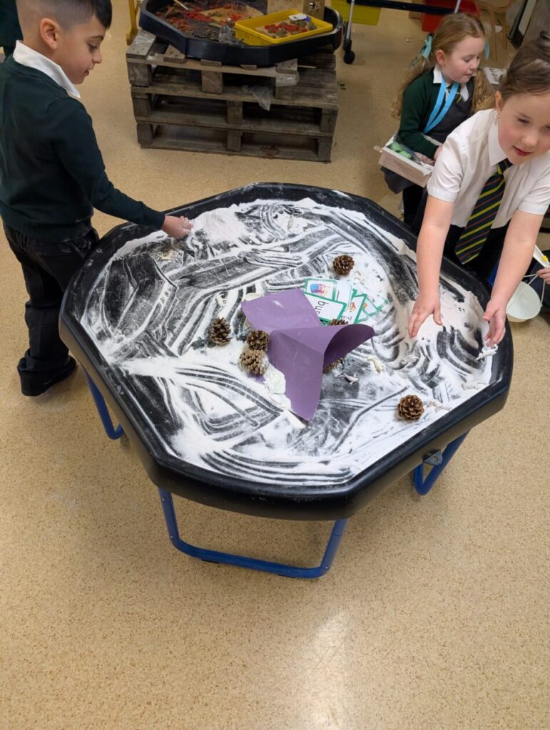 Fun in the snow! Primary one loved our snow tuff tray ,they were practising their letter B formation and making snow men .