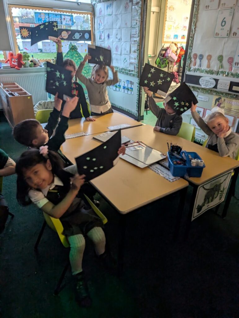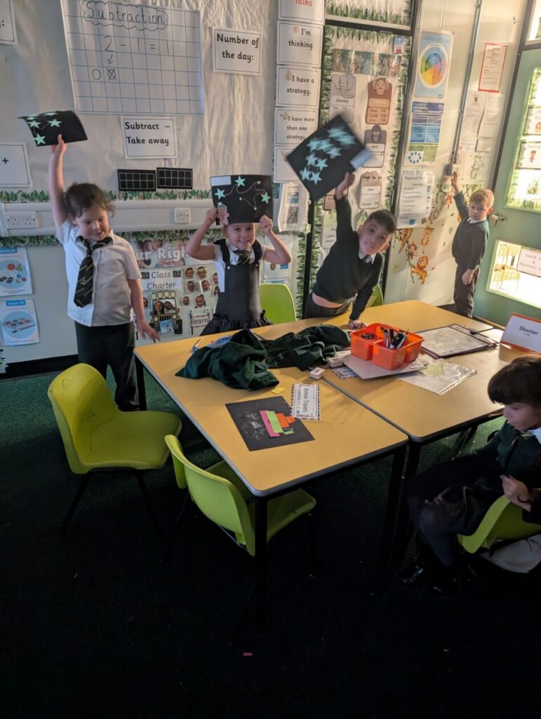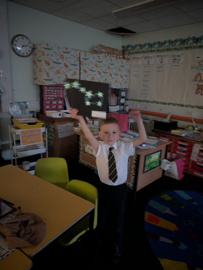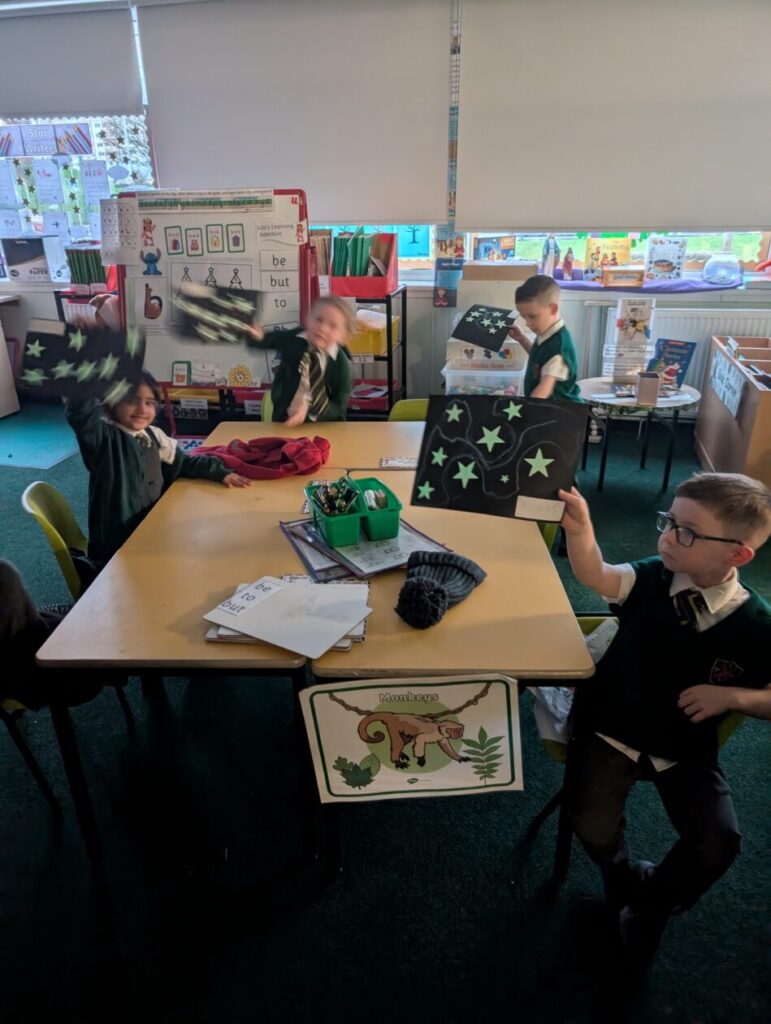 Primary one were learning all about stars today . They designed their own constellations using glow in the dark stickers . Fantastic work! 8th December